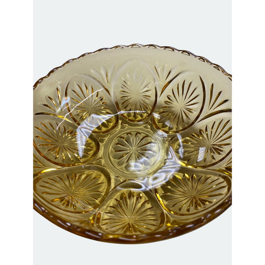 Vintage Amber Glass Decorative Bowl With Scalloped Edge & Starburst Design