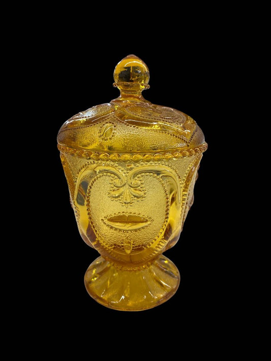 Vintage Amber Heart Scroll Pattern Candy Dish with Lid