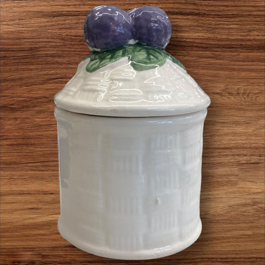 Vintage Ceramic Jam Jar Sugar Bowl Basket Weave Purple Berries Top NO SPOON