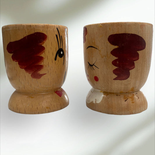 Vintage Set of 2 Hand painted Wood Egg Cups