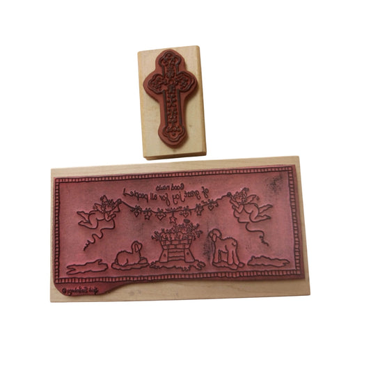 Christian Rubber Stamp Set With Cross & Nativity Scene Design "Good News Of Great Joy" Message
