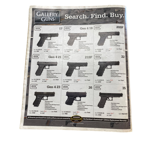 Glock Firearms Catalog Featuring Popular Models Gen 4 19 17 20SF 26 22 23 & 21SF With Specifications