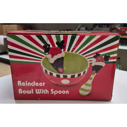 Whimsical Christmas Reindeer Ceramic Serving Bowl & Matching Spoon Set With Festive Ribbon