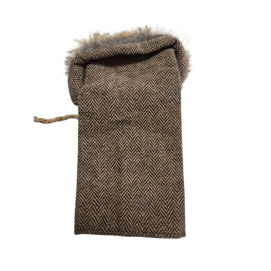 Mini Christmas Wine Bottle Bag Herringbone Coat Faux Fur Collar & Buttons