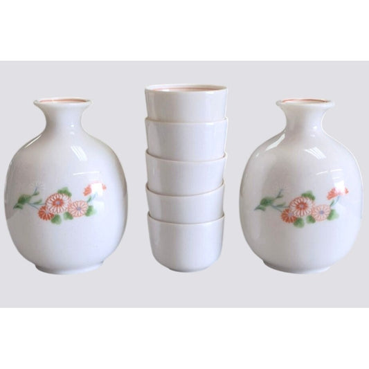 Vintage Nagoya Ceramic Floral Sake Set With 2 Bottles & 5 Cups