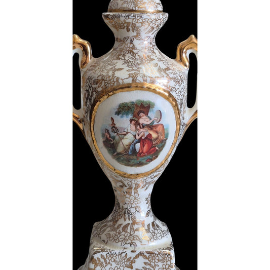 Vintage Ceramic Double Horn Vase Pink Rose Accents Gold Detailing