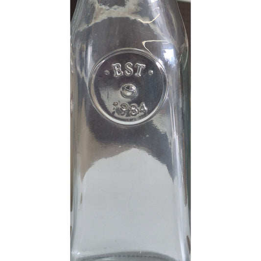 Glass Carafe Jar Cork Lid Est 1984 Embossed Design Clear Square Base 10" Tall