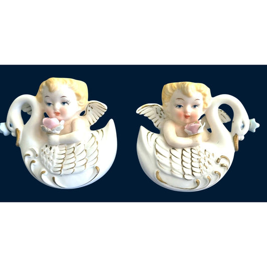 Vintage Angel Cherub Gold Swan Wall Pocket Planter Set 2