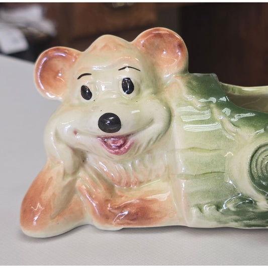 Vintage American Bisque Pottery Bear in Log