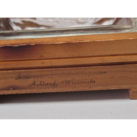 Vintage Wood Glass Ashtray Holder Cow Postcard Insert Lake Superior Ashland WI