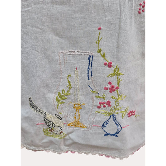 Vintage Hand-Embroidered Table Runner With Pink Crochet Edge & Floral Design
