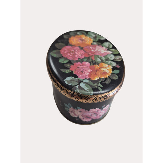 Vintage Meister Black Floral Tin Oval Box With Gold Accents Made In Brazil