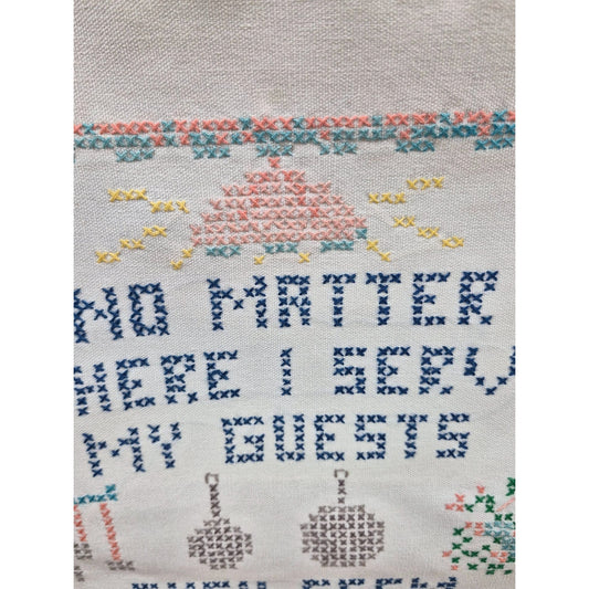 Vintage Cross-Stitch Kitchen Decor Wall Hanging Embroidered Quote "No Matter Where I Serve My Guests"