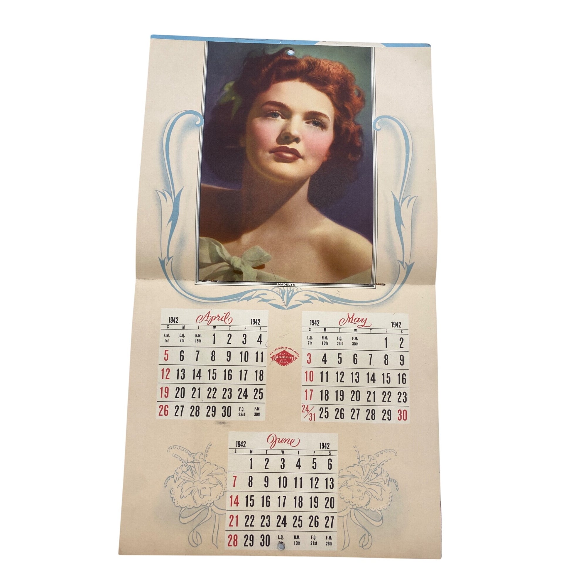 • April–June: Portrait of Madelyn, framed in blue florals; Peter’s Diamond Brand Shoes emblem beneath.