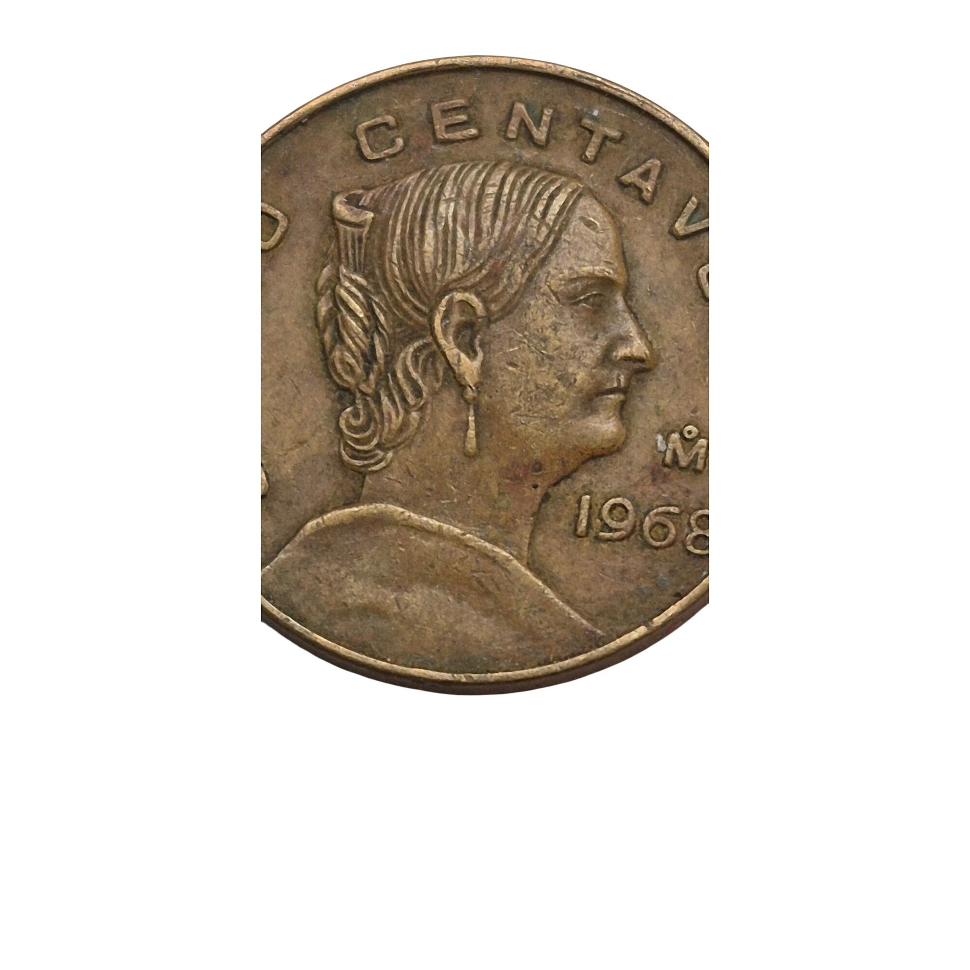 A vintage 1968 Cinco Centavos coin featuring a profile of a woman and the iconic Mexican eagle design. A great addition to any coin collection.