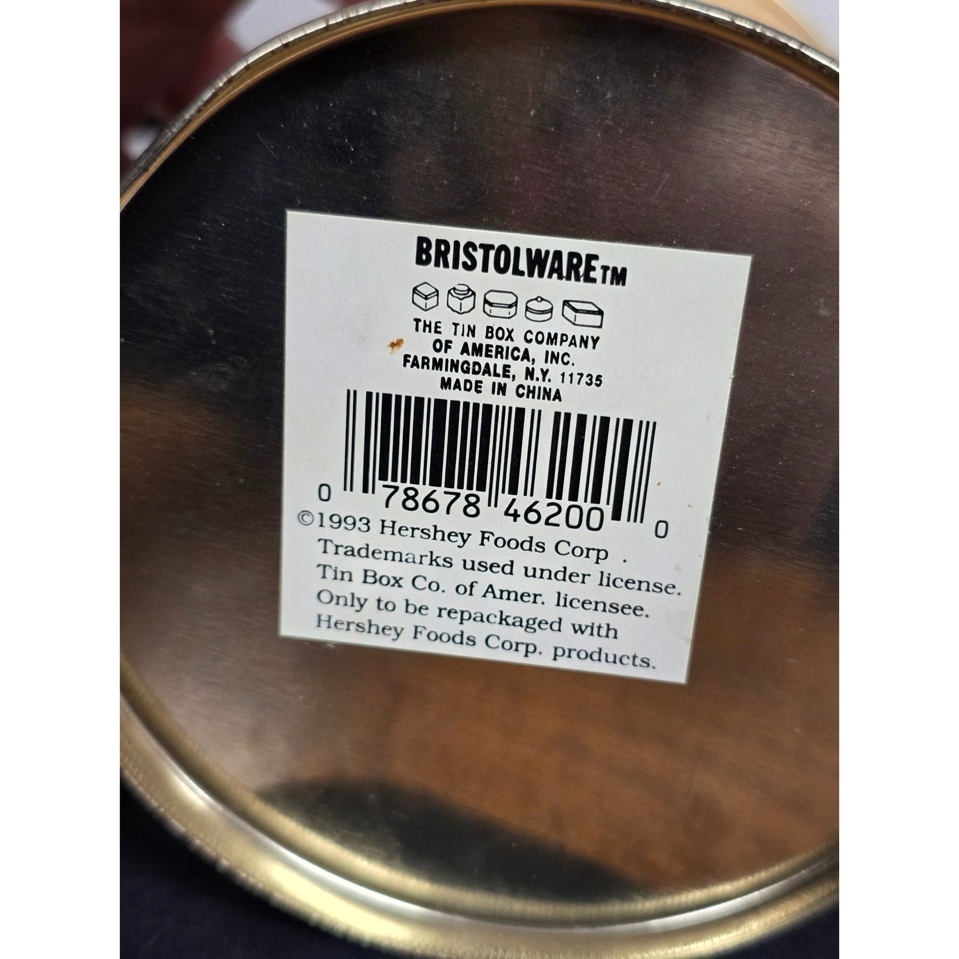 Vintage 1993 Bristolware tin can featuring iconic Hershey's Milk Chocolate design. Perfect for collectors and chocolate lovers alike. Add a touch of nostalgia to your kitchen or display shelf with this charming piece.