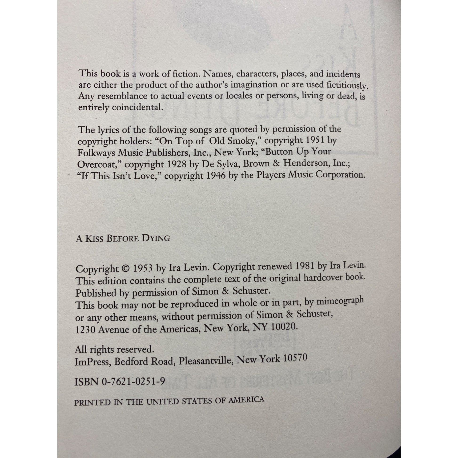 This vintage hardcover edition of Ira Levin's "A Kiss Before Dying" is a timeless classic of suspense and intrigue. Its sturdy red cover makes it a collector's gem, ideal for anyone who appreciates gripping literature and vintage book aesthetics.