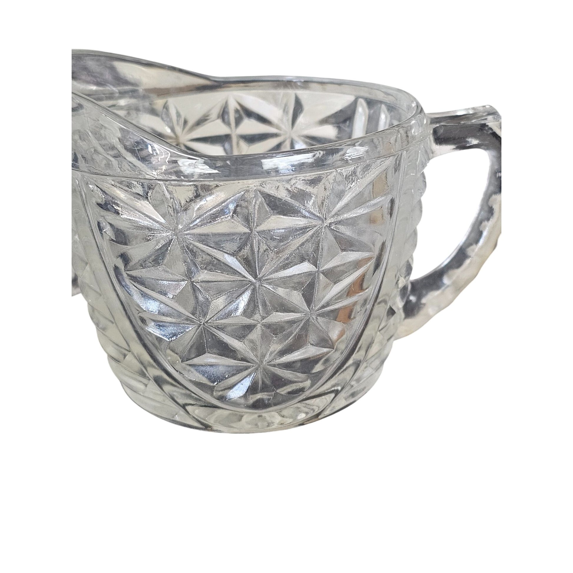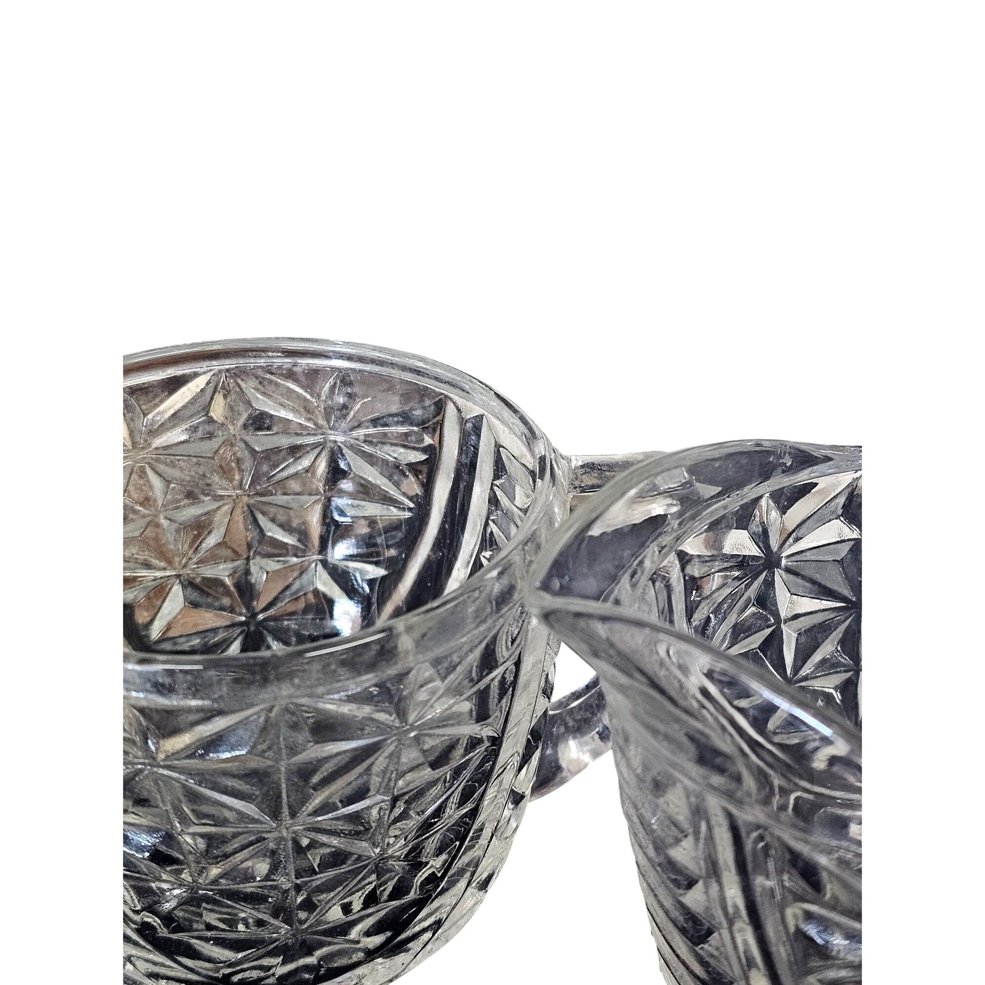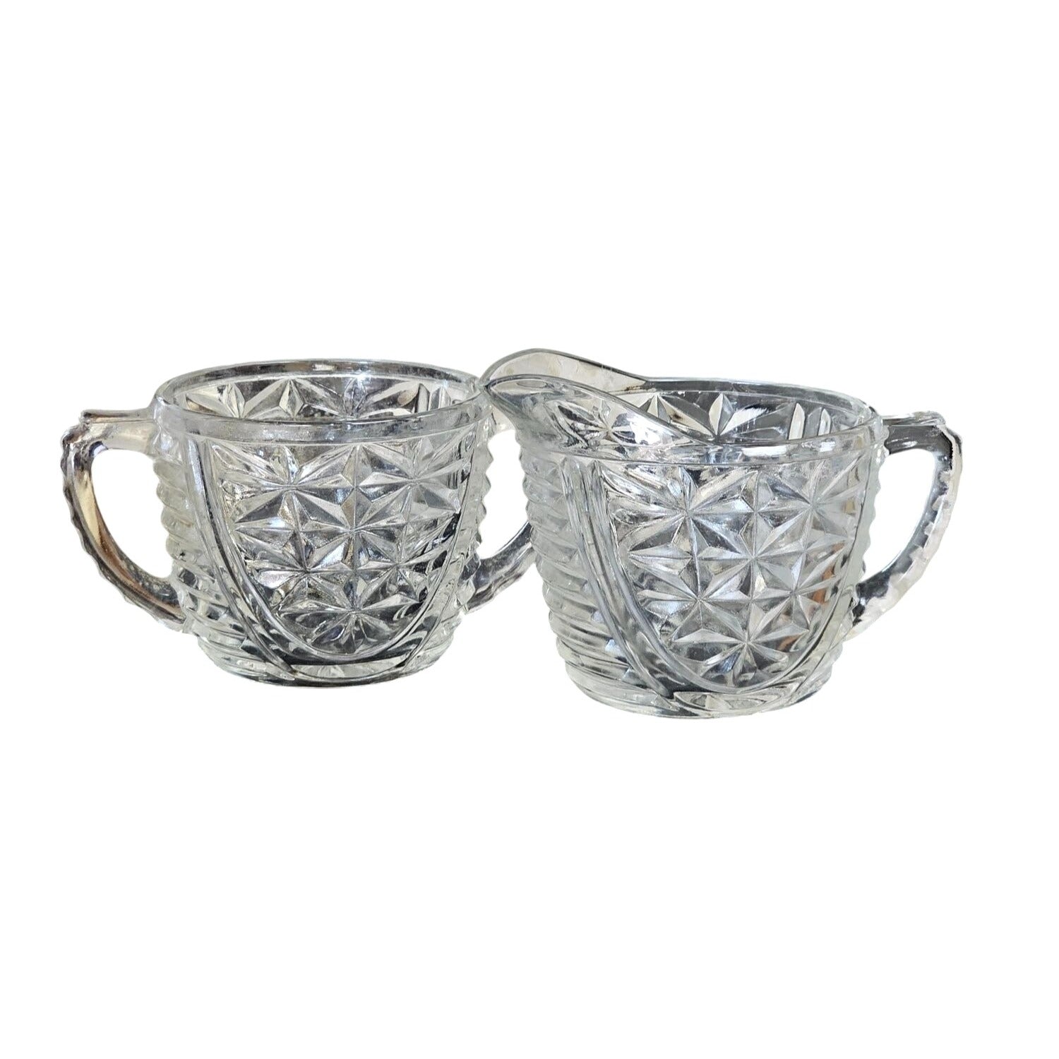 This vintage Anchor Hocking Stars and Bars cream and sugar set features intricate glass patterns, perfect for collectors or everyday use. Beautifully crafted to enhance your table setting, these pieces add a touch of elegance and nostalgia to any occasion. A charming addition to your glassware collection.