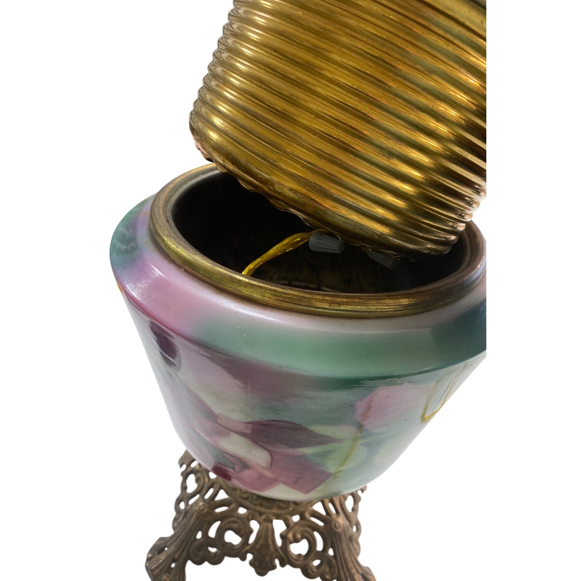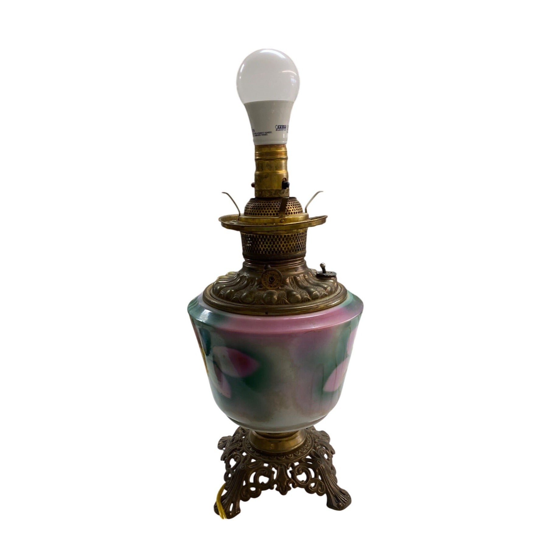 Transform your space with this captivating antique brass and glass lamp, now converted to electric. Its hand-painted floral design exudes timeless charm and elegance, making it an enchanting centerpiece for any decor.