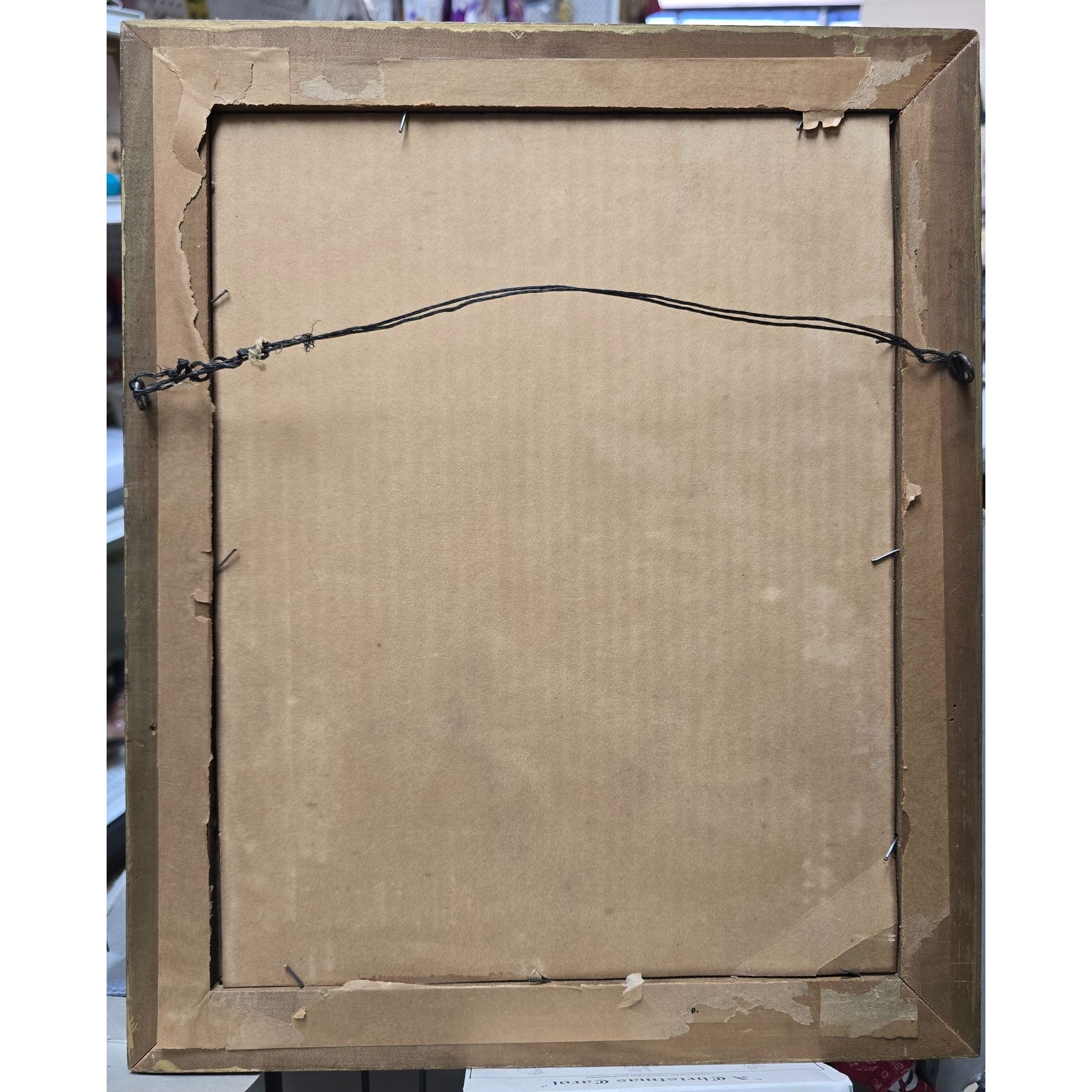 The print has been folded in the lower left corner. Otherwise, it's very nice. The frame is even better. Measurements: 13"x16".