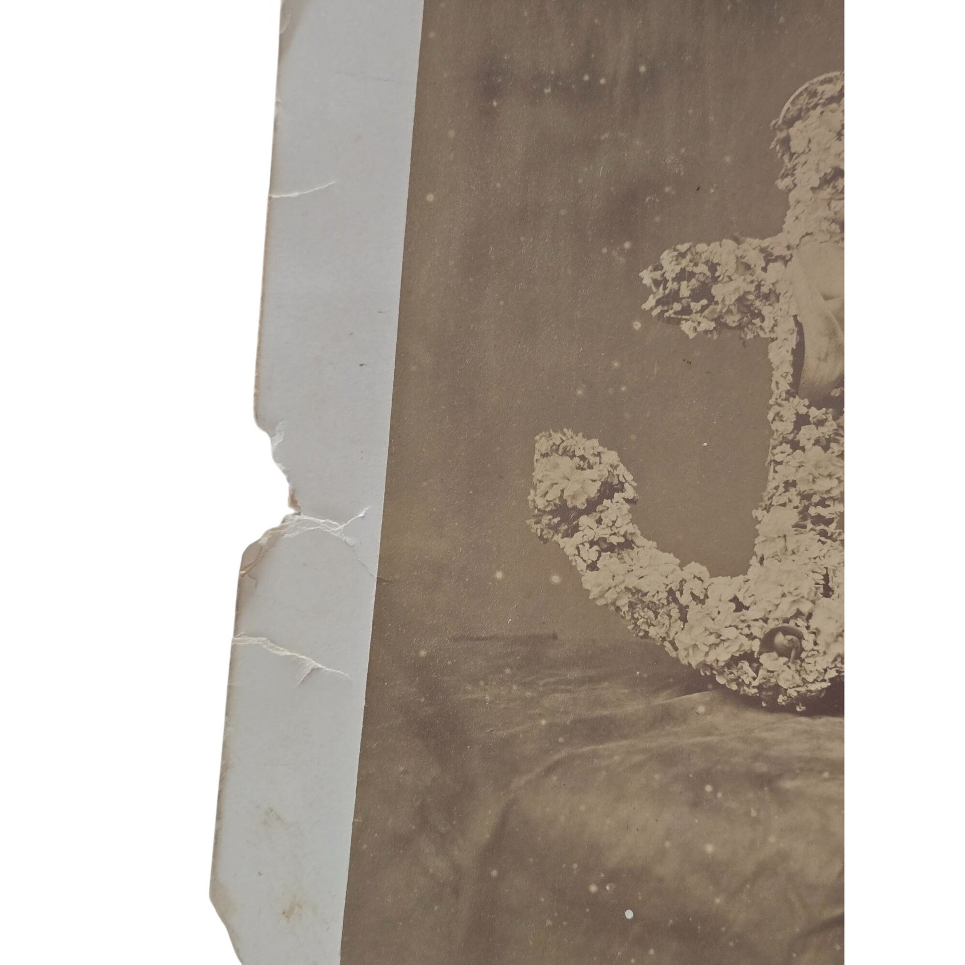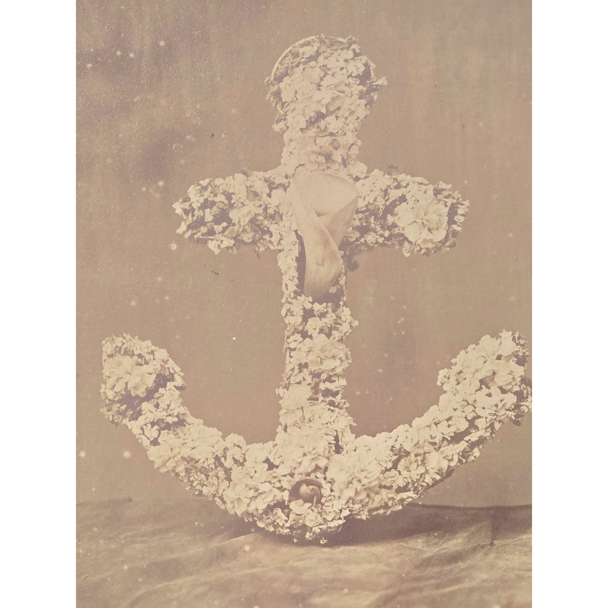 A hauntingly beautiful original sepia-toned photograph, likely dating to the late 19th or early 20th century. This solemn image captures a memorial display featuring two symbolic floral arrangements—an anchor and a cross—resting atop what appears to be a draped casket. Above them hangs an oval-framed portrait of the deceased, dressed in formal attire.