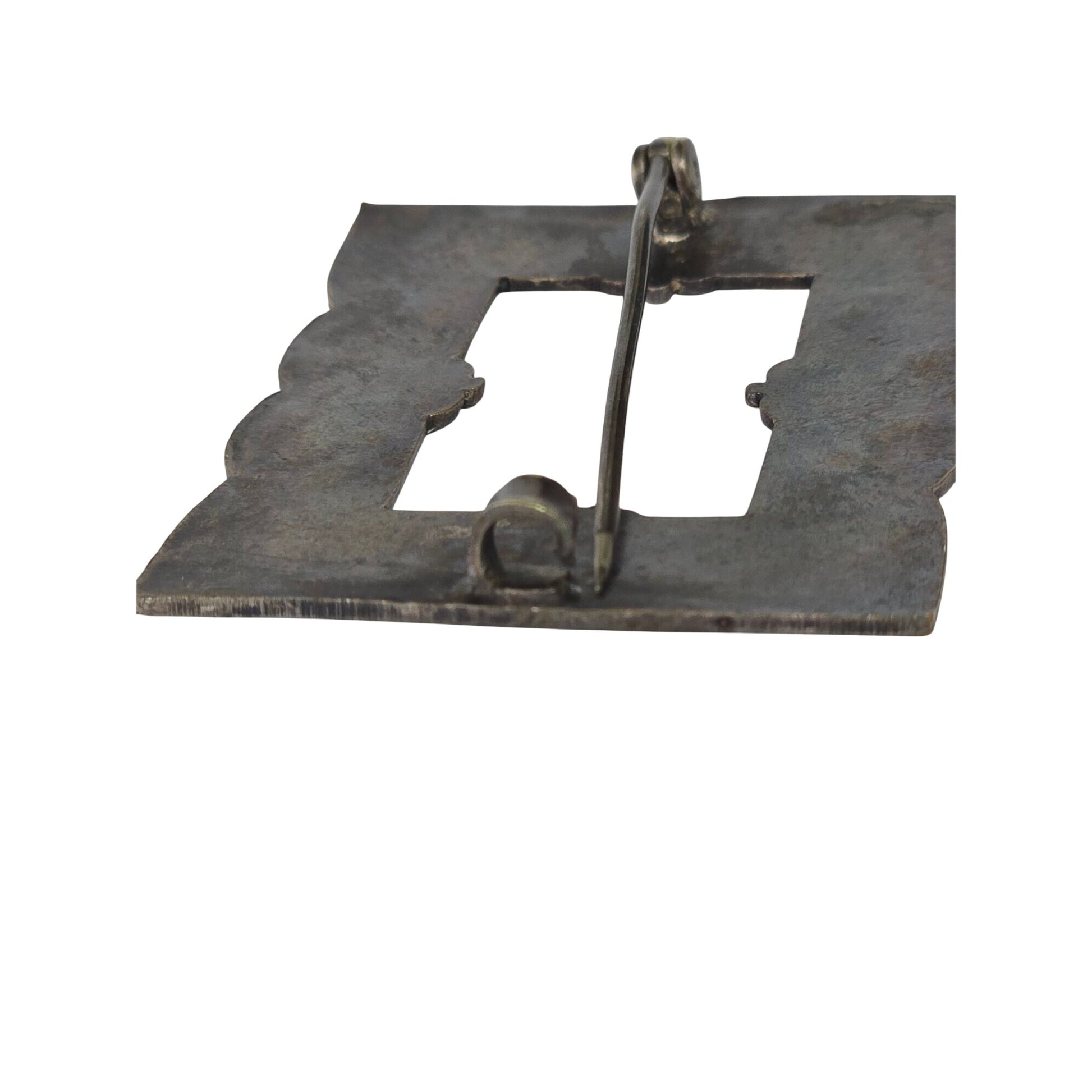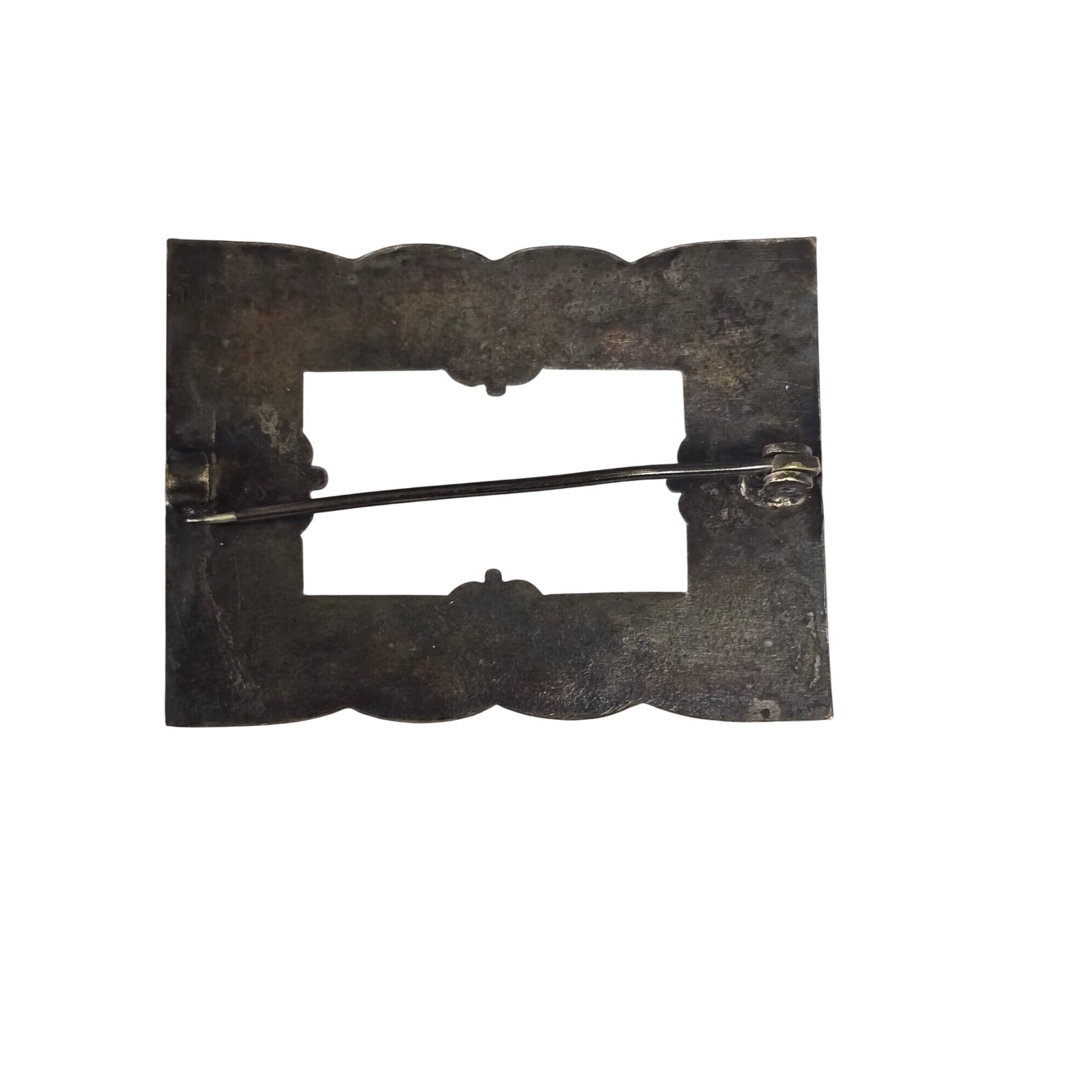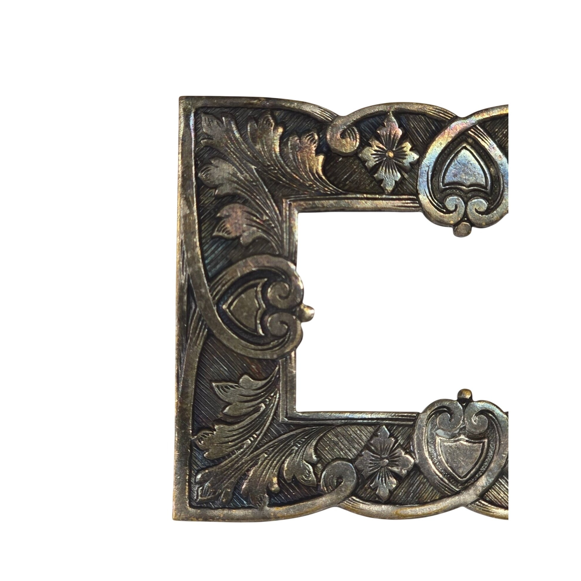 Beautiful antique Victorian sash pin featuring ornate raised floral and scrollwork details with heart motifs. Made in a brass‑tone metal with a deeply embossed design, this piece dates to the late 1800s–early 1900s and was originally worn to secure a fabric sash or belt. The open center and decorative edges give it a romantic, old‑world look perfect for collectors, costumers, or display.