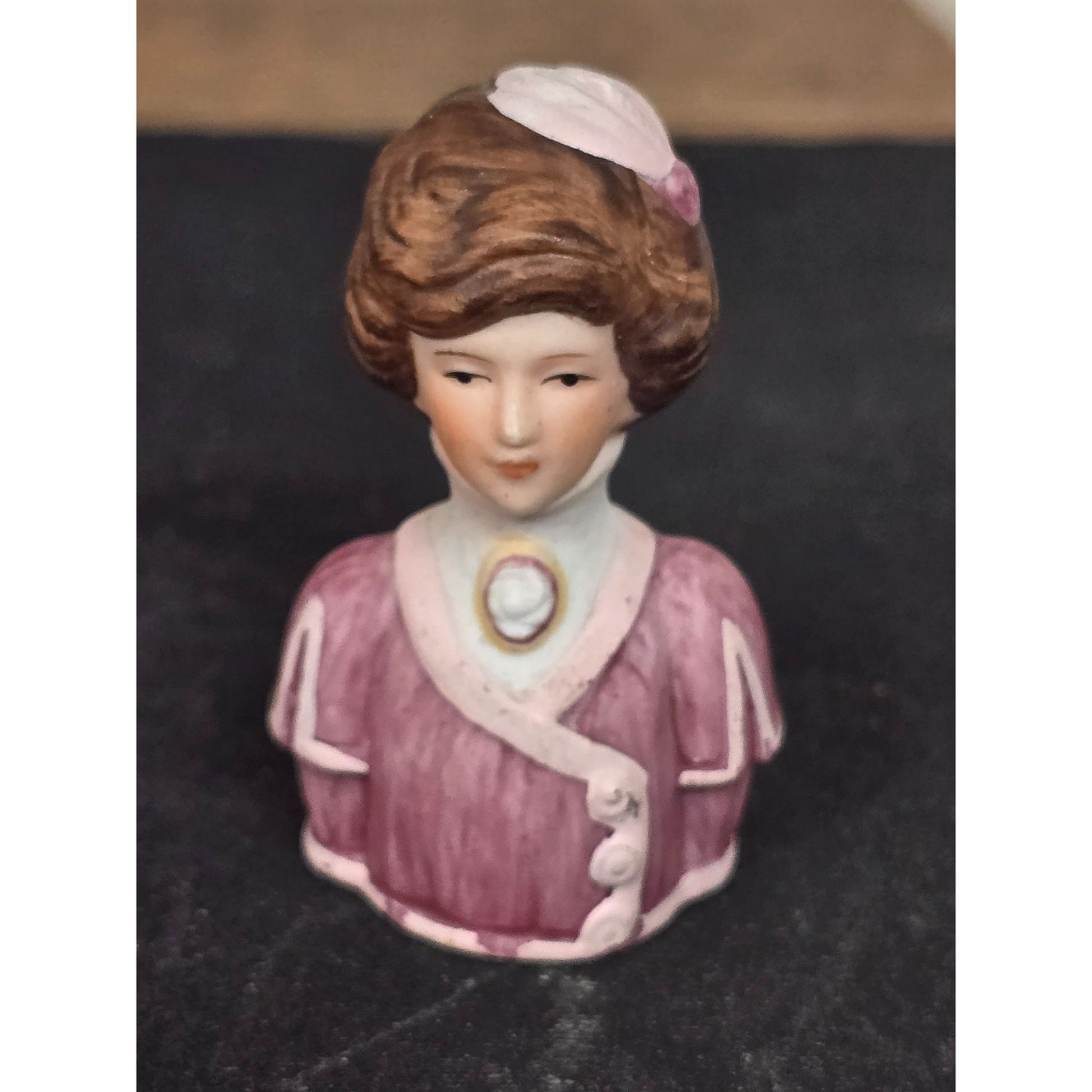 This charming figurine doubles as a unique thimble, showcasing vintage-inspired elegance. A thoughtful gift or addition to a collector's display.
