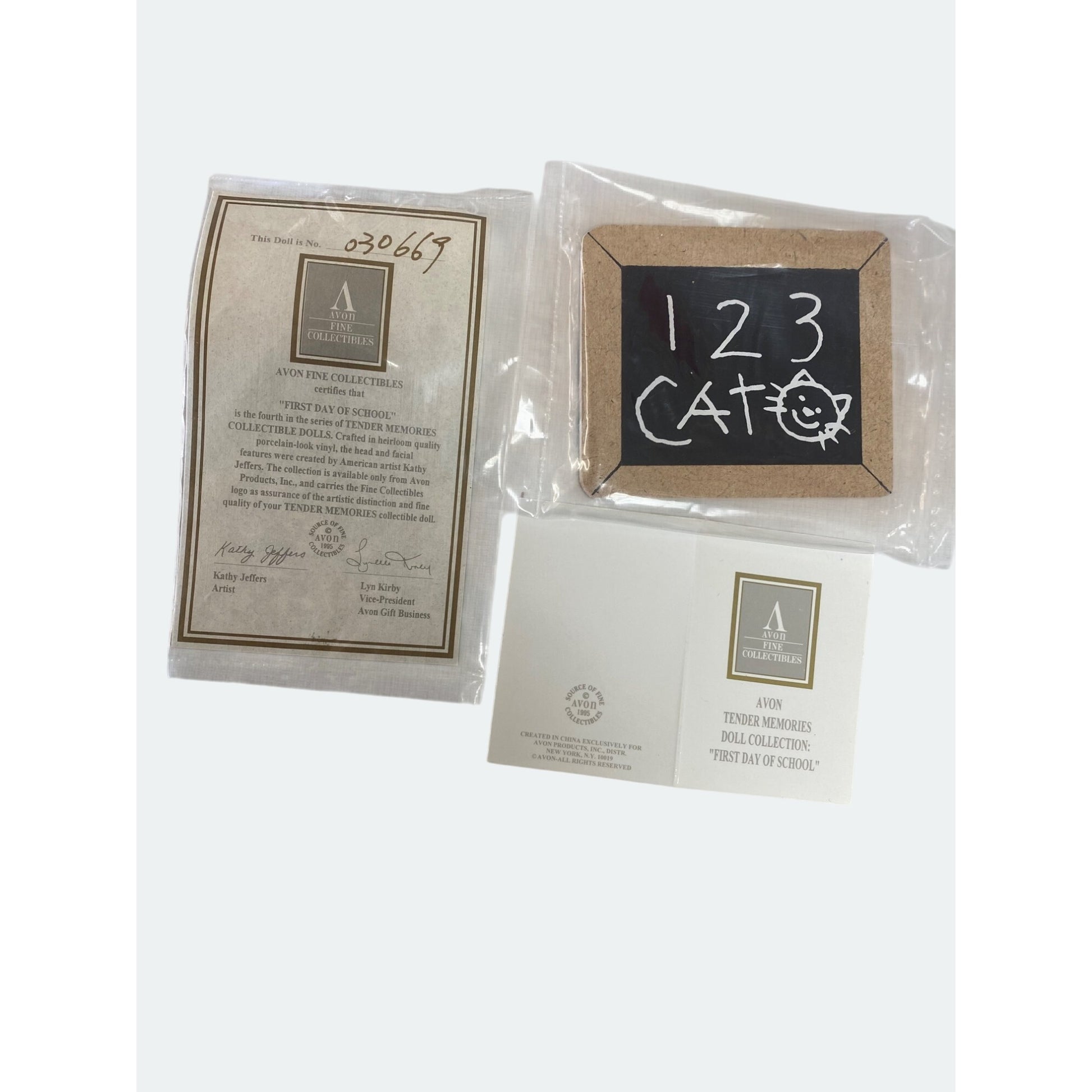 This Avon collectible doll embodies nostalgia with her school-themed design. Adorned in a red plaid dress with a lace collar, she is a charming addition to any collection.