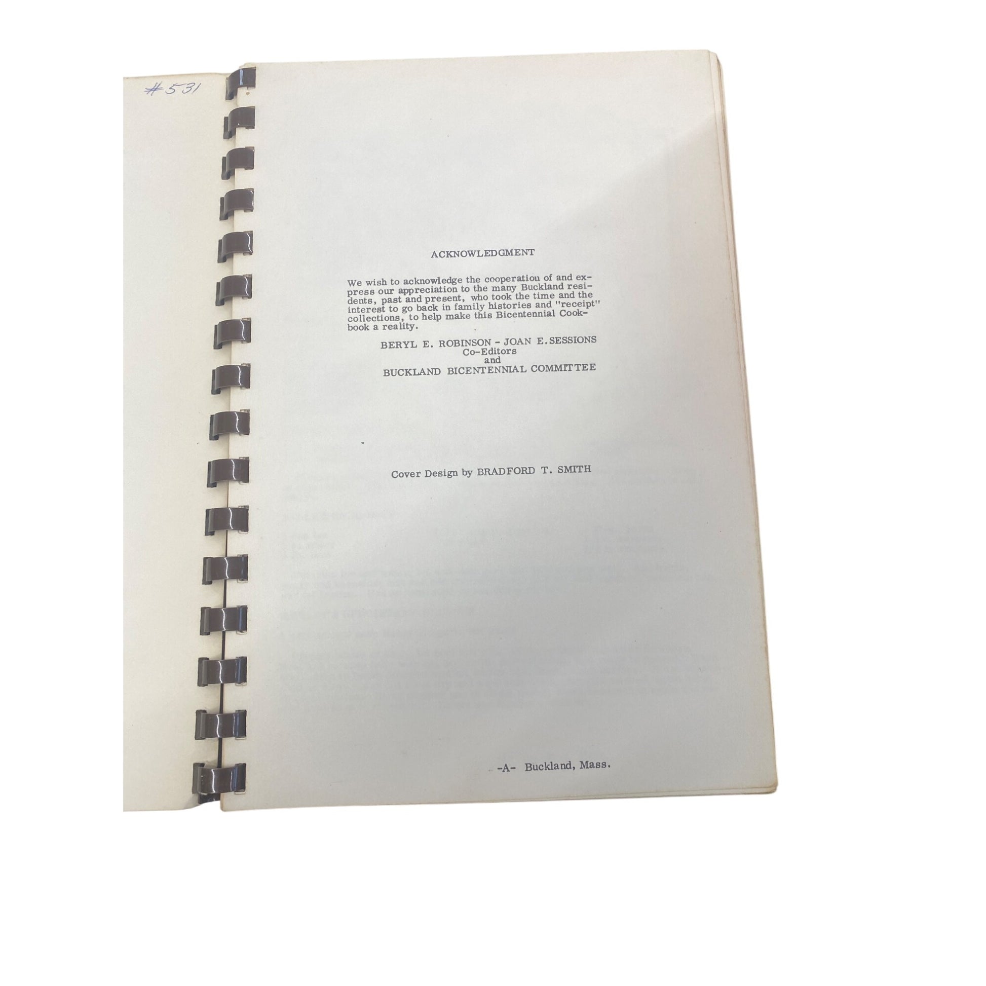 Buckland Massachusetts Bicentennial Cookbook 1779-1979 Spiral-Bound First Edition