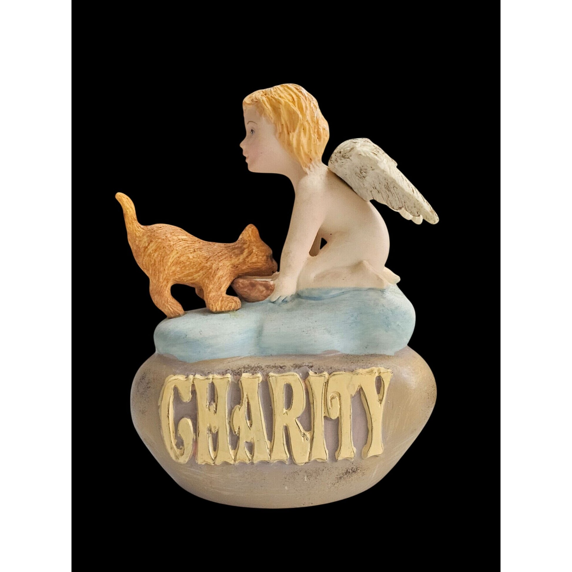 Embrace the spirit of compassion with this charming Charity figurine featuring a tender angel and playful kitten. Crafted by Crown Point in 1998, this ceramic collectible is a meaningful addition to any home or space, symbolizing love, kindness, and benevolence. Display it as a reminder of the joy in giving.