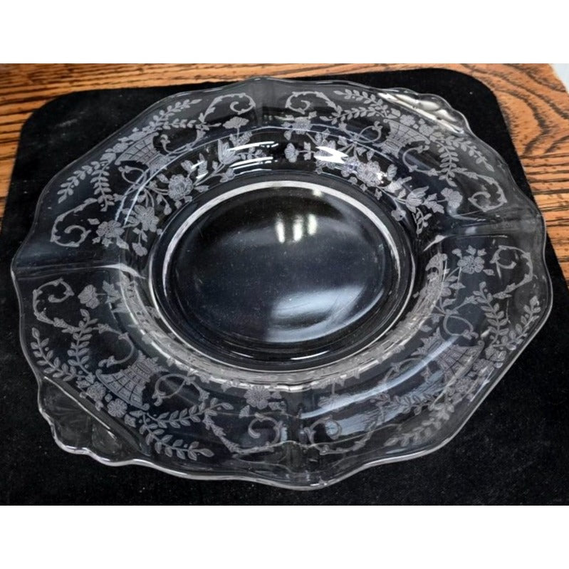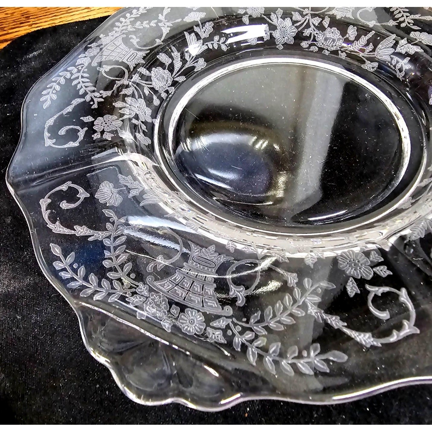 This charming vintage bon bon plate features exquisite floral etching on clear glass. Ideal for serving sweets or as a decorative piece, its timeless design adds elegance to any setting.