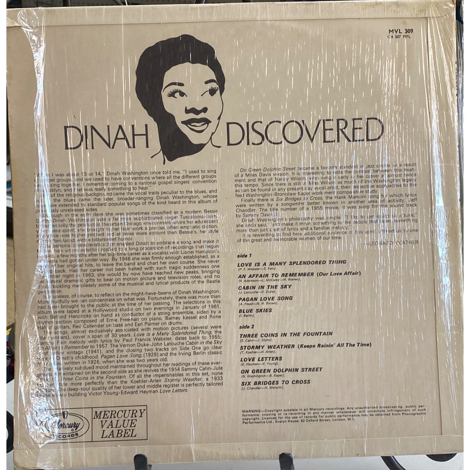 Dinah Washington "Dinah Discovered" Vinyl LP 33 RPM Mercury Records MVL 309
