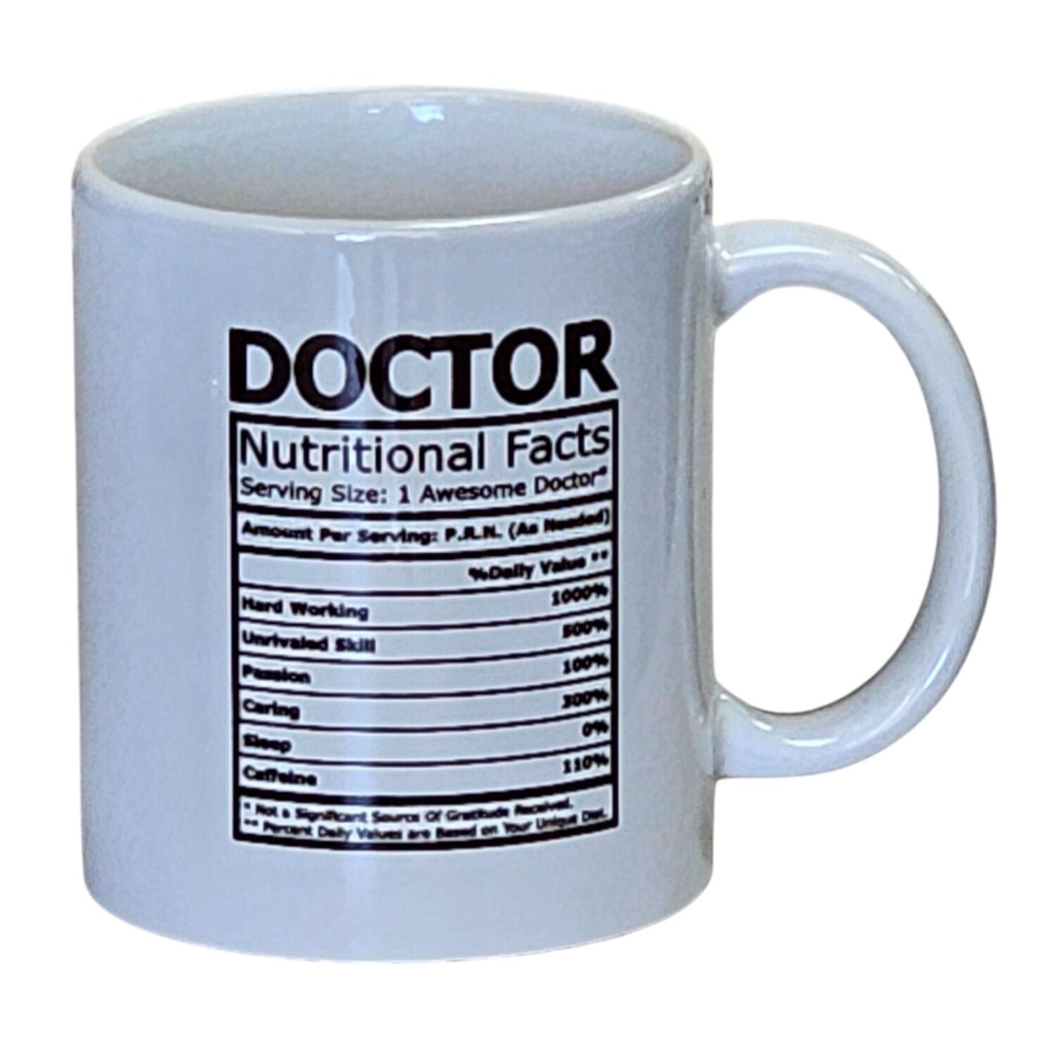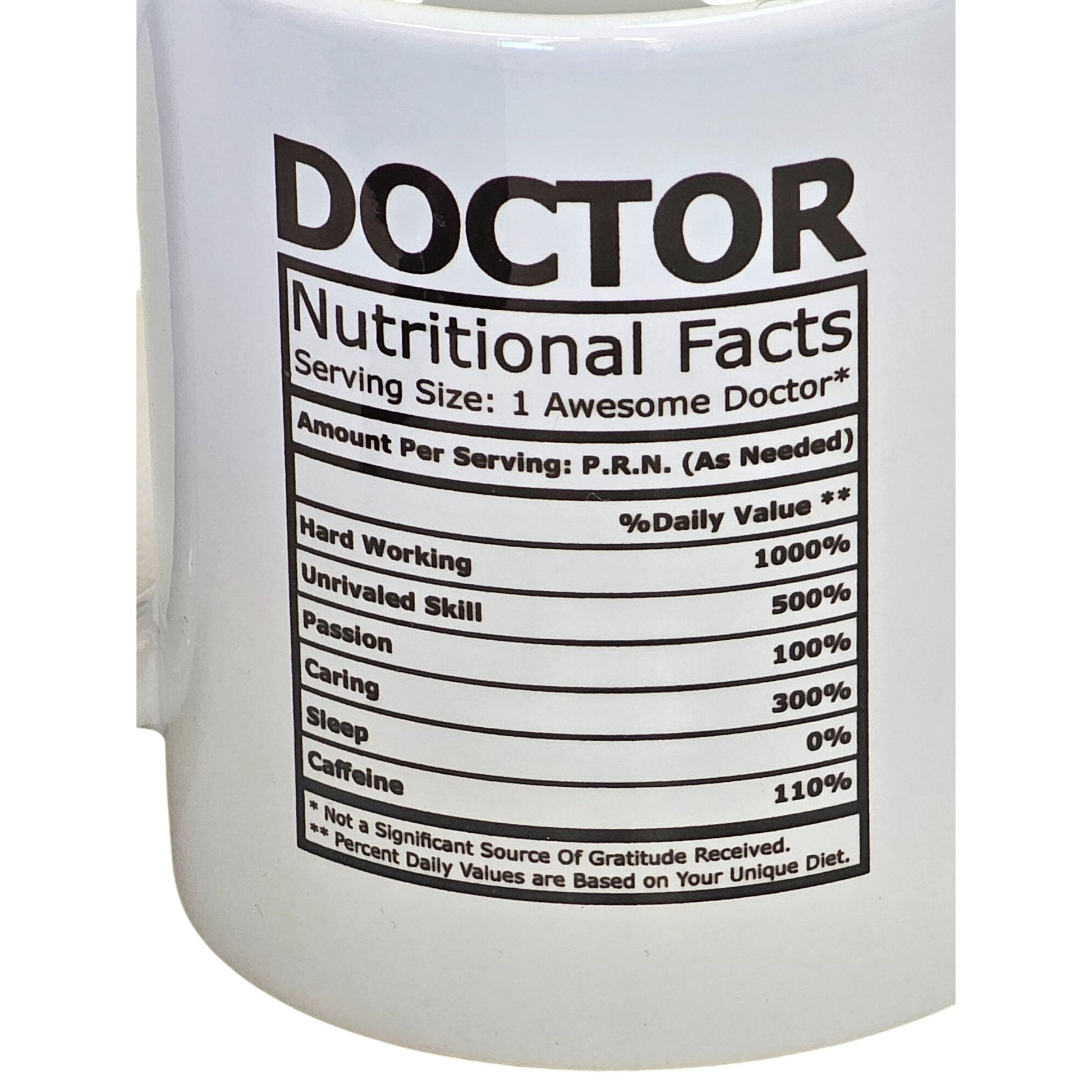 Celebrate the dedication and hard work of doctors with this unique nutritional facts mug. Made of durable ceramic, it's both stylish and functional. This 11 oz mug is a thoughtful gift for medical professionals, showcasing their qualities in a humorous way. Ideal for daily coffee breaks or desk decor.