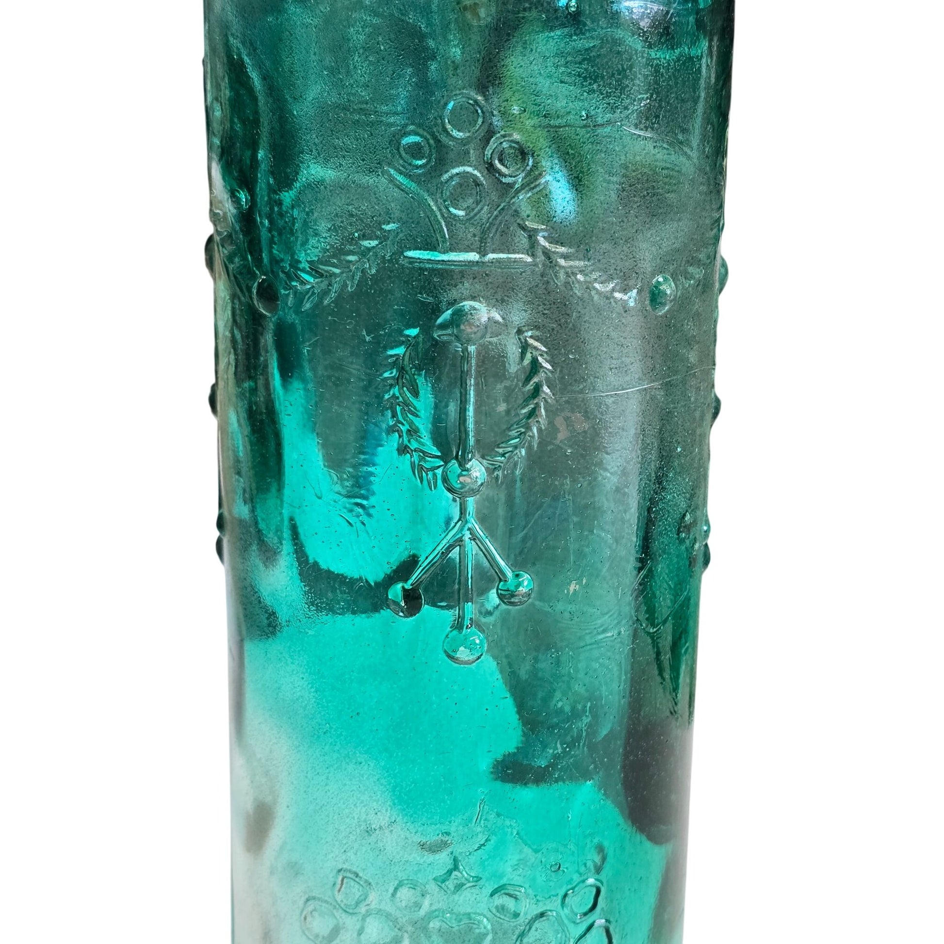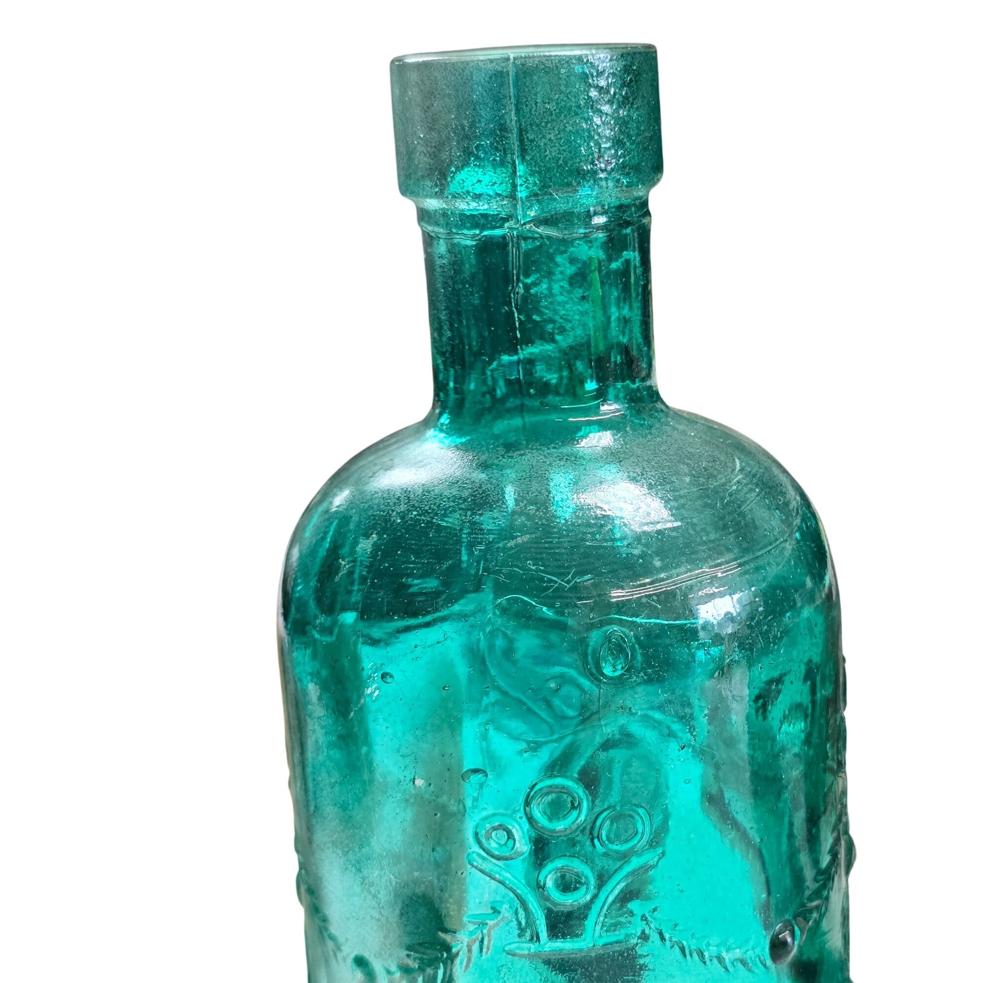 This embossed glass bottle features an intricate design, making it a captivating piece for collectors and home decorators. Its green hue adds a touch of elegance, and its vintage charm is undeniable. Ideal for enhancing a room's aesthetic or as a unique addition to a glassware collection.