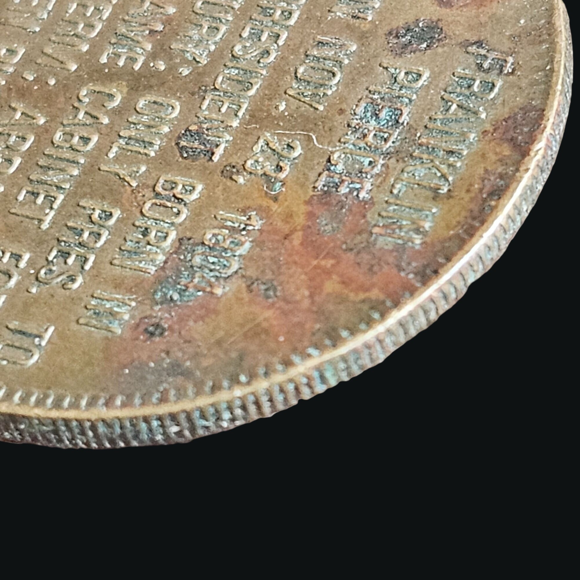 Scratches and tarnish visible on both sides. Diameter = 1 inch.