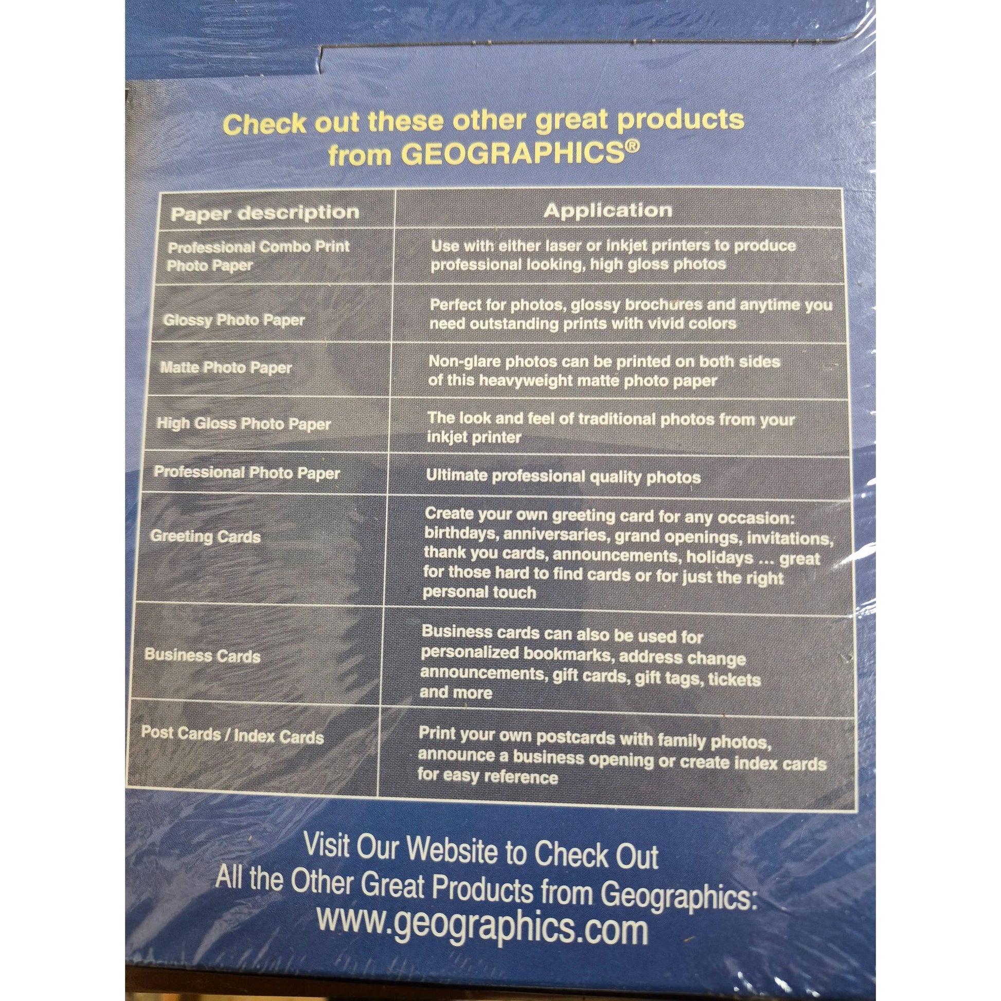 Enhance your photographs with Geographics Everyday Glossy Photo Paper. Designed for home and office use, this photo paper produces vibrant, high-quality prints that capture every detail. With its glossy finish, your prints will have a professional look and feel, perfect for framing or sharing with loved ones.