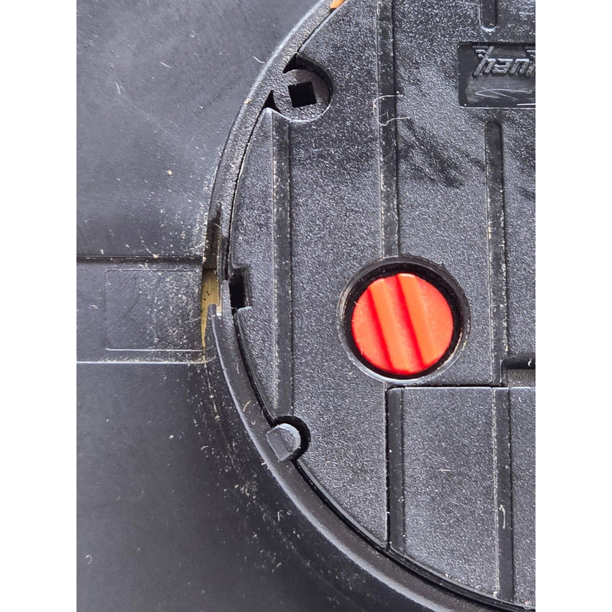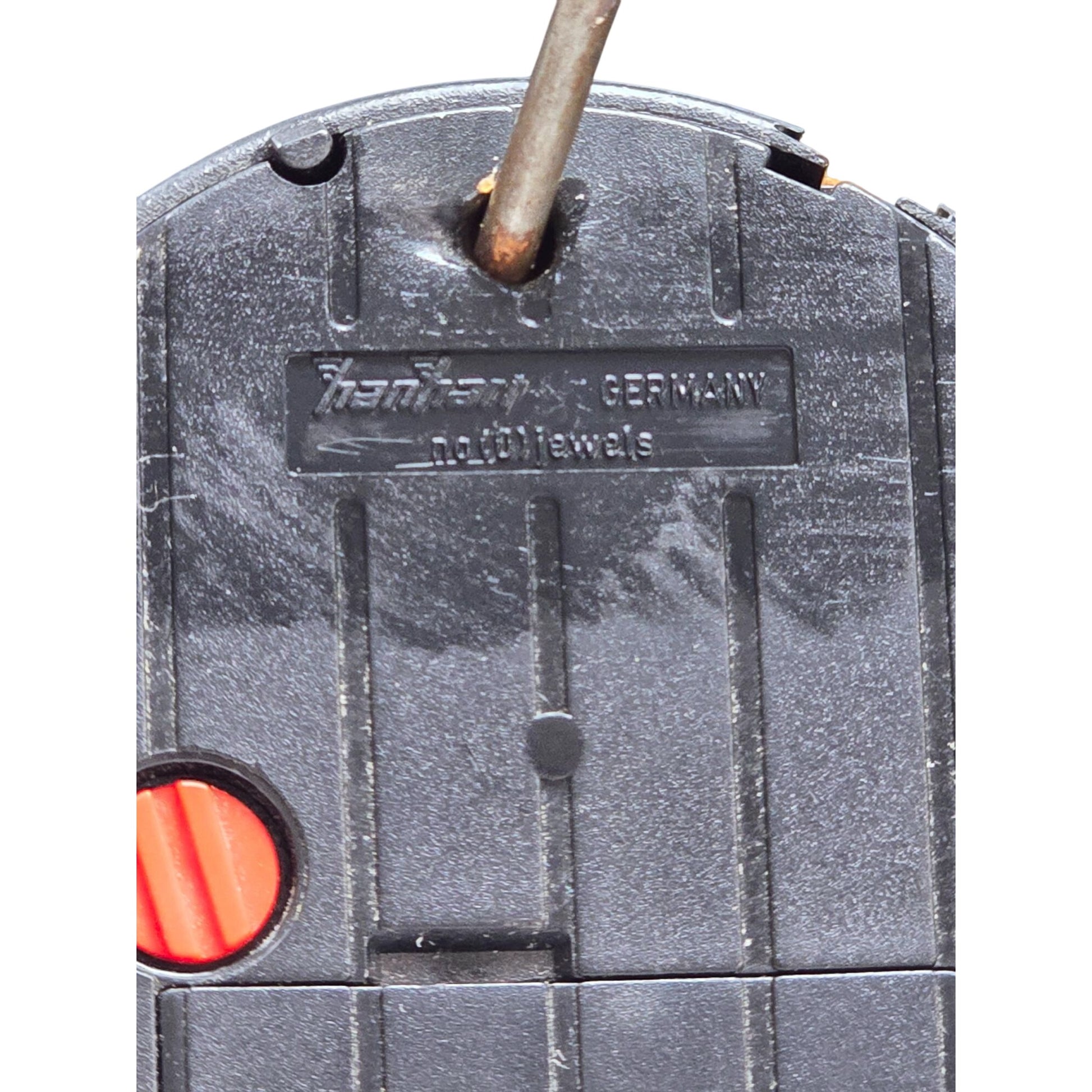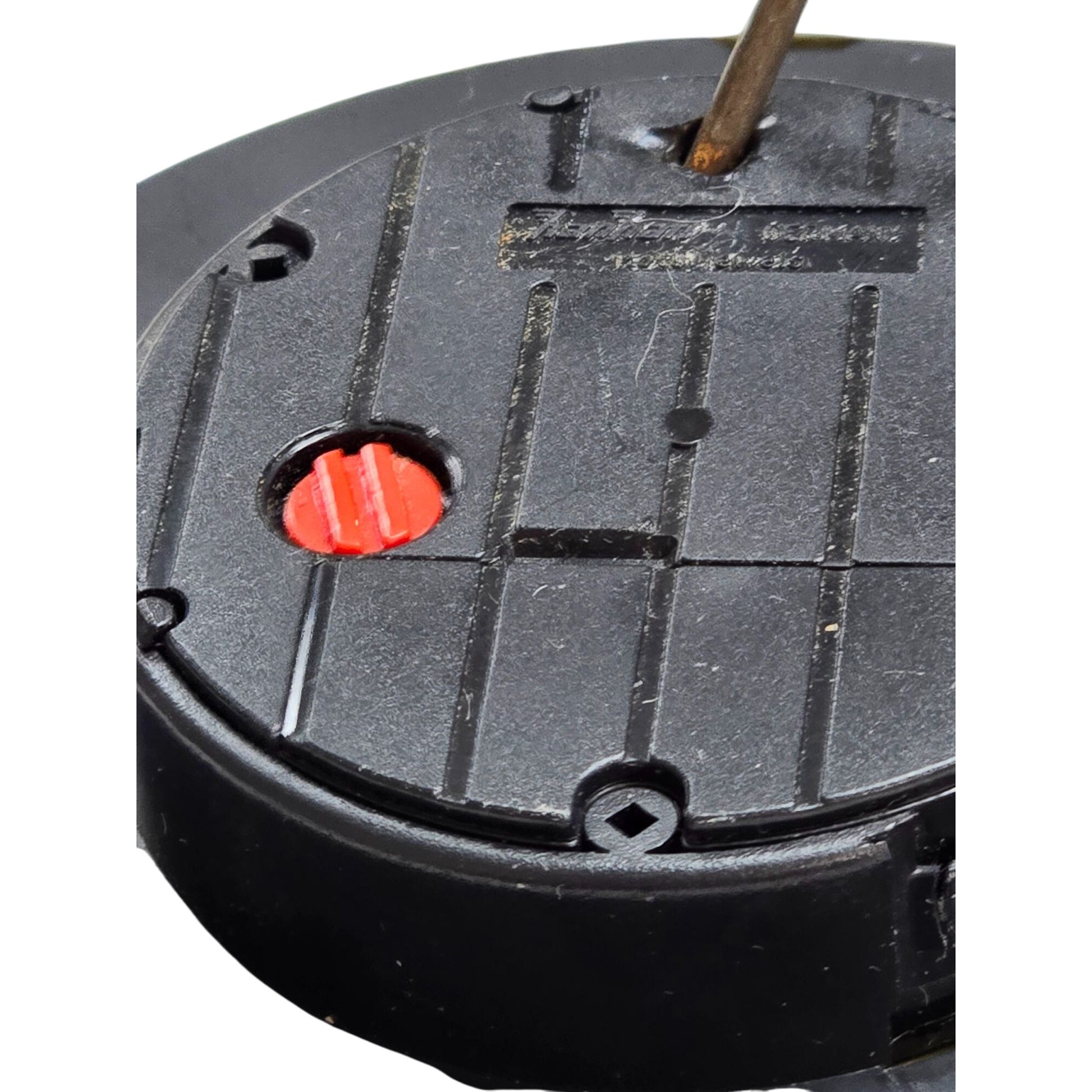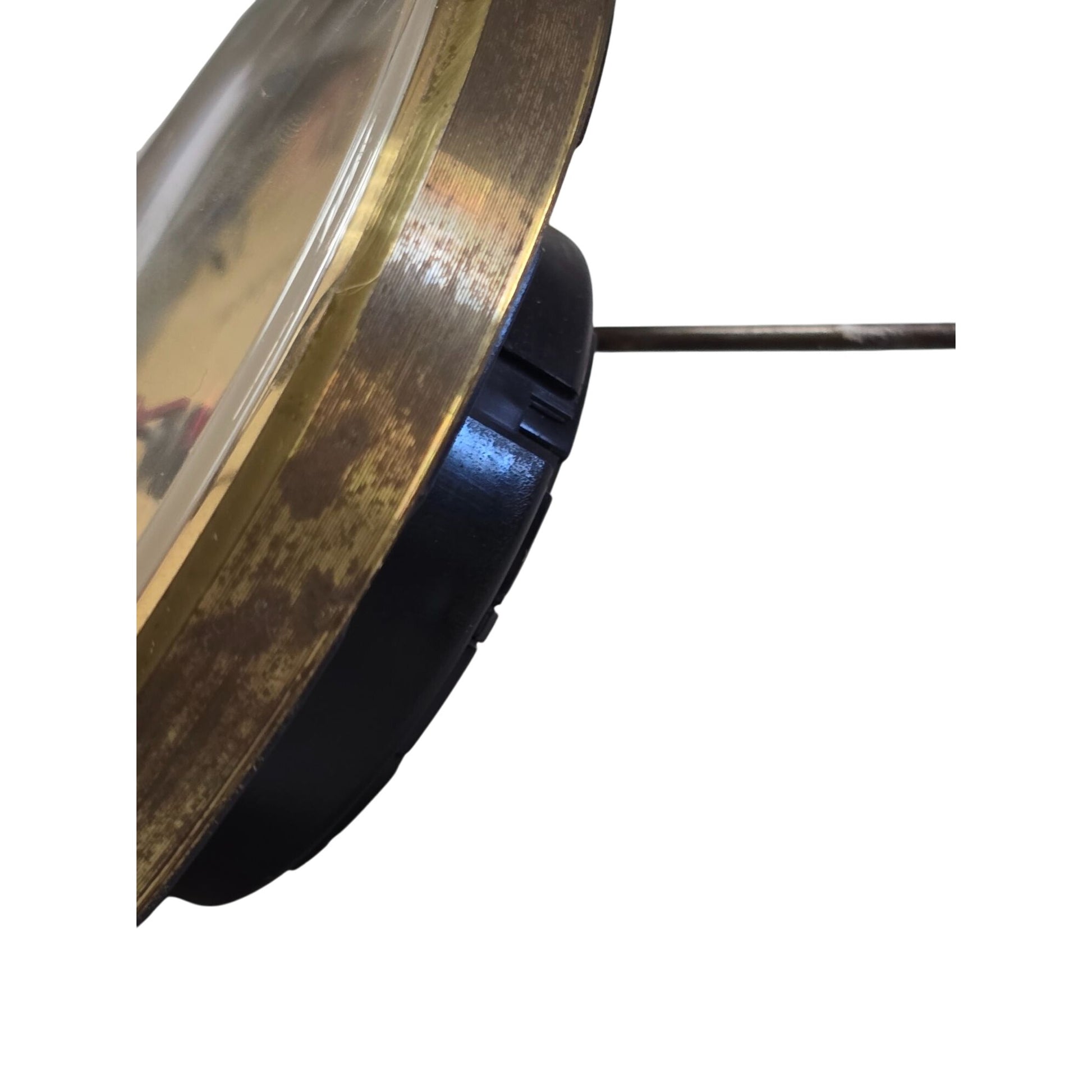 Please note that there are light scratches on the clock's face. The hands turn freely using the red knob, but the clock is not currently running, and the battery compartment has not been checked. Additionally, there is a nail protruding from the back of the clock.