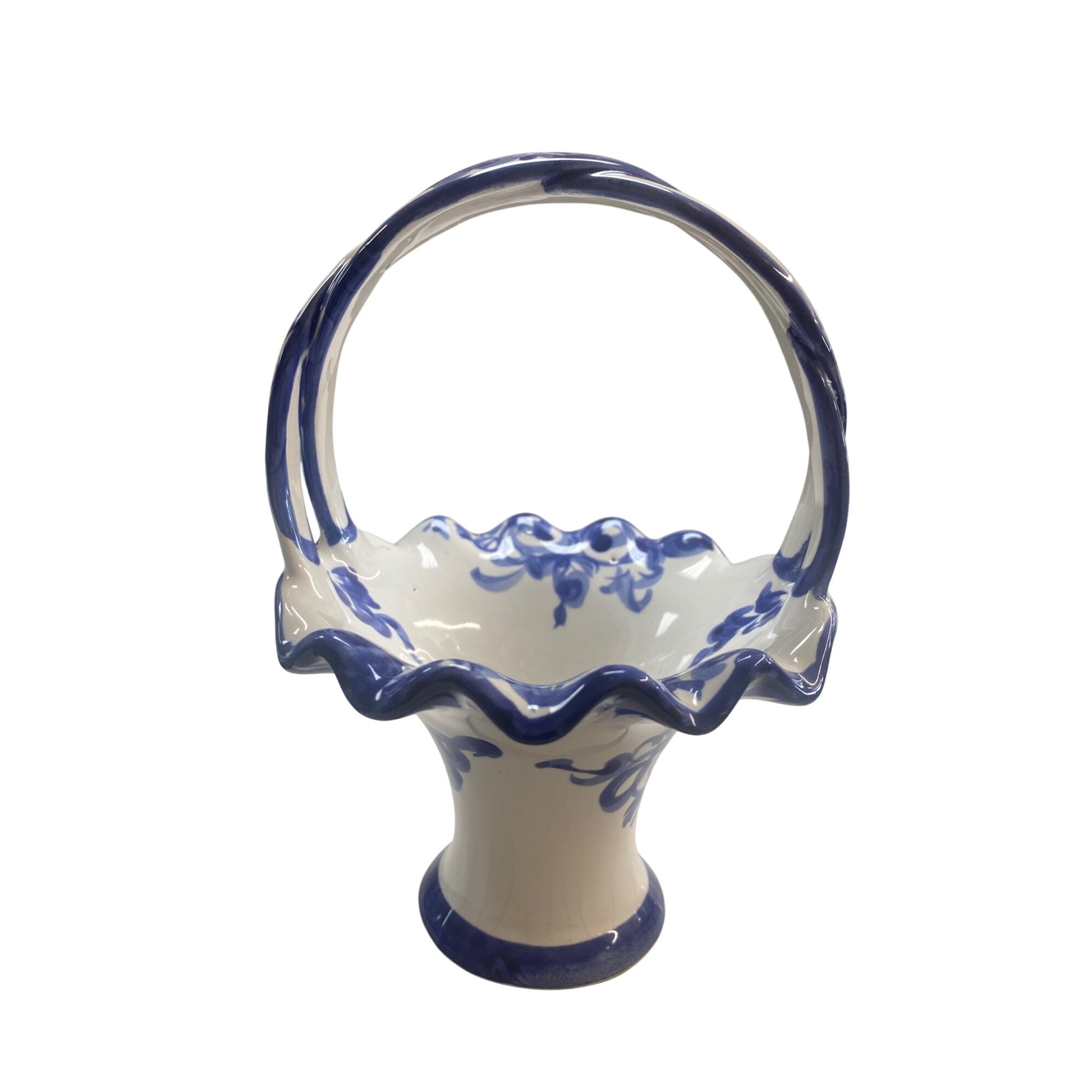 Embrace timeless elegance with this hand-painted ceramic basket vase. Featuring intricate blue floral patterns, it adds charm to decor or gifting.
