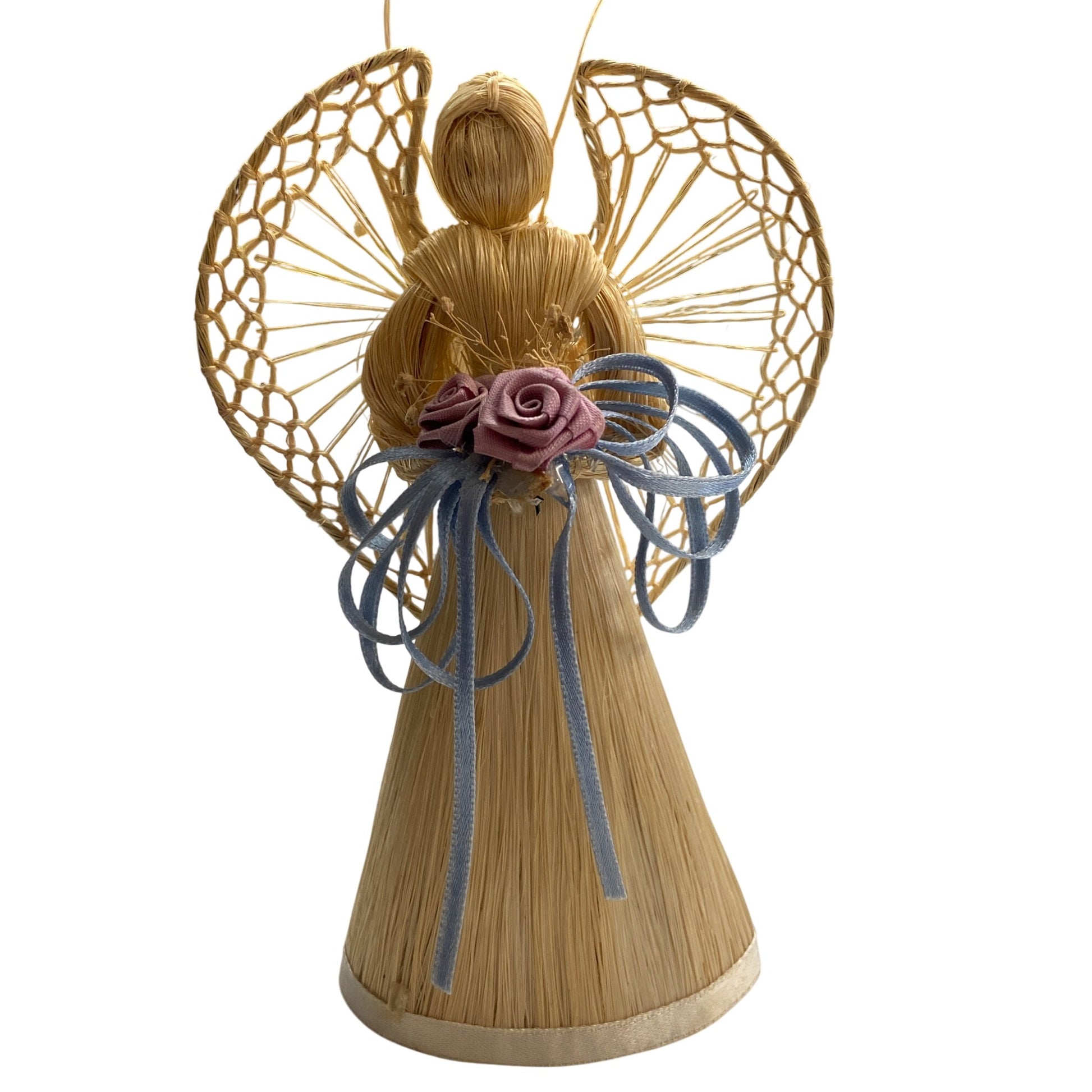 Elevate your home decor with this exquisite handcrafted straw angel, adorned with delicate floral accents. This unique piece embodies artisanal craftsmanship, bringing a touch of elegance and serenity to any space. Its neutral tones ensure it complements various interior styles, making it a thoughtful gift or a cherished addition to your collection.