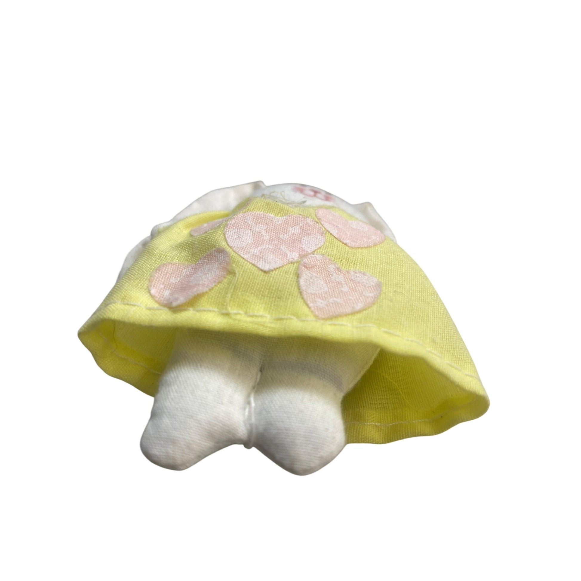 Embrace charm and whimsy with this delightful handmade bunny brooch. Its cute design and bright yellow dress with heart accents add a playful touch to any outfit. Crafted with care, this accessory is perfect for adding a dash of character.