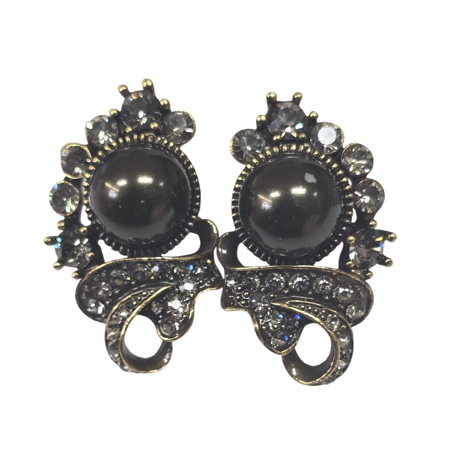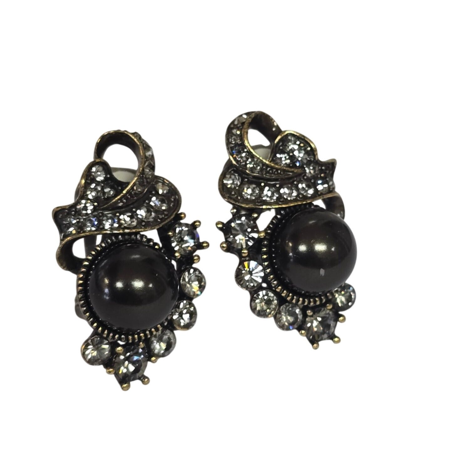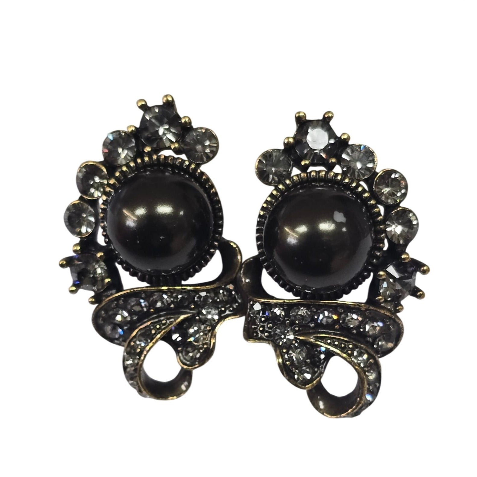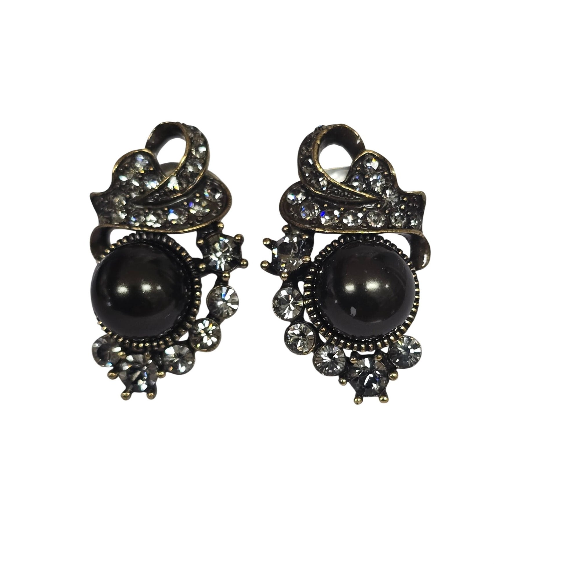 Enhance your wardrobe with these Heidi Daus earrings, blending vintage charm and modern sophistication. Featuring a black pearl look center, sparkling crystals, and a clip-on design, they exude elegance and convenience.