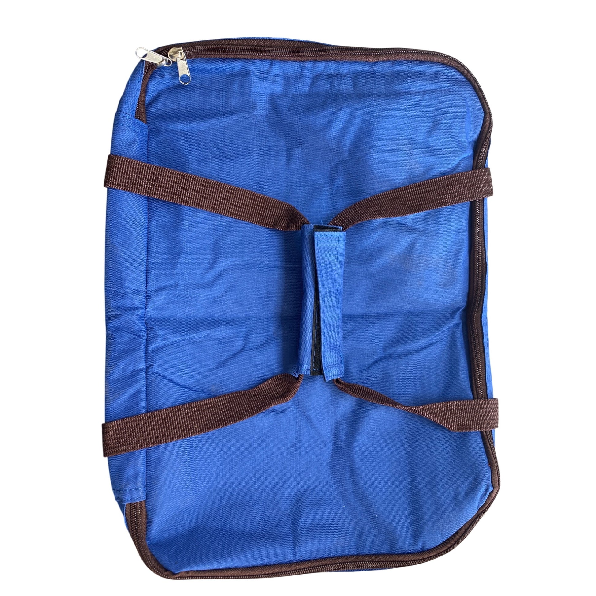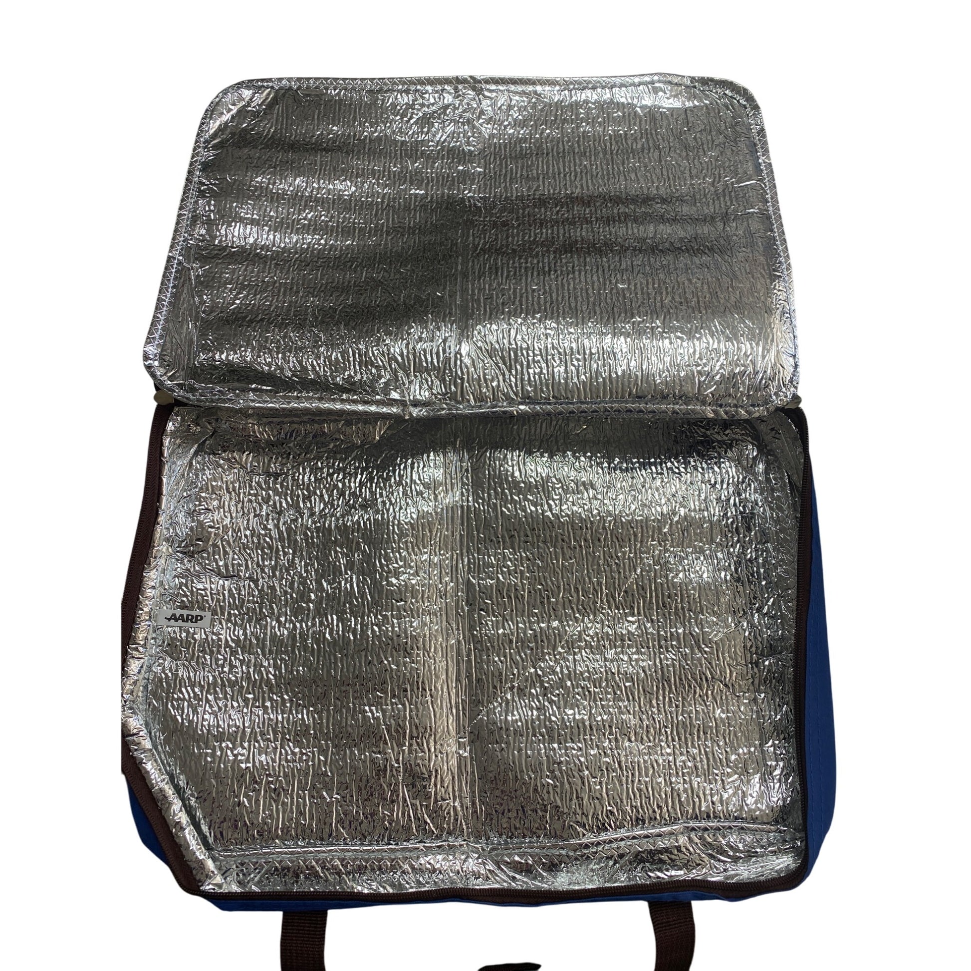 This insulated food delivery bag is designed to keep your food items at the desired temperature during transport. Its vibrant blue exterior is complemented by sturdy brown handles, ensuring easy and secure carrying. The zipper closure offers quick access, while the reflective inner lining helps maintain temperature efficiency.
