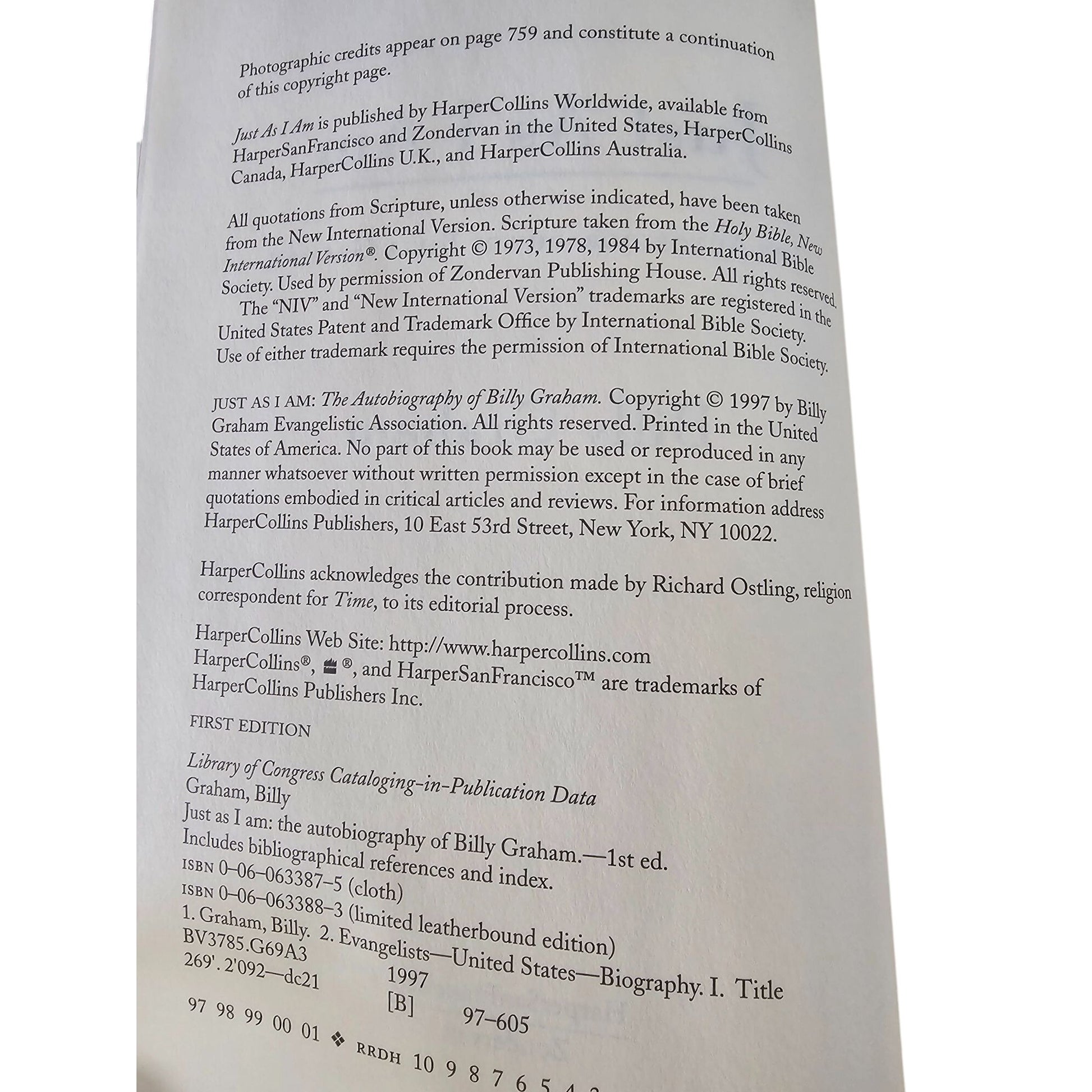 Just As I Am: The Autobiography Of Billy Graham Hardcover Harper San Francisco Zondervan 1997 Edition