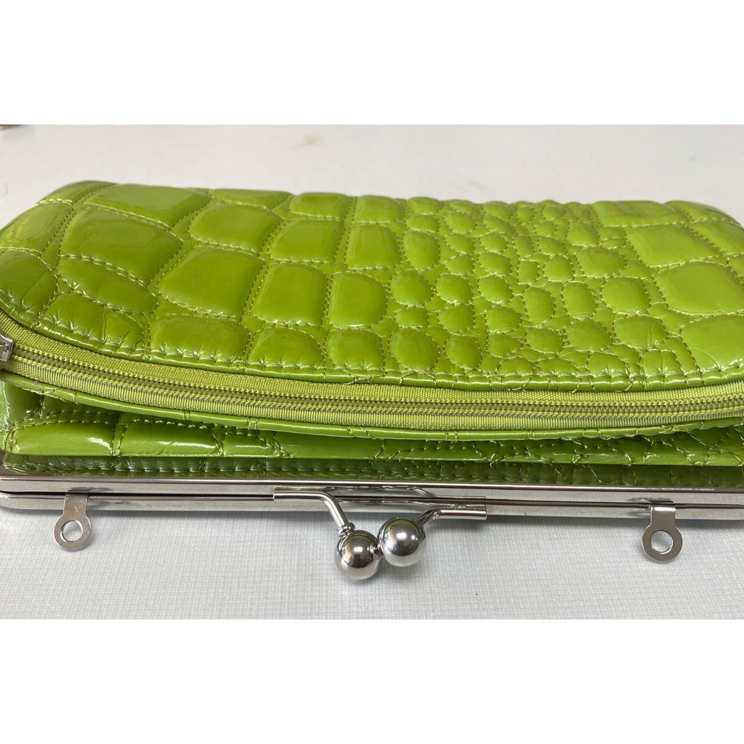 This Kristine clutch wallet stands out with its vibrant lime green hue and crocodile-embossed texture. The pink interior adds a pop of color, making it both stylish and functional. Its compact size is ideal for carrying essentials, ensuring you stay organized without compromising on elegance.