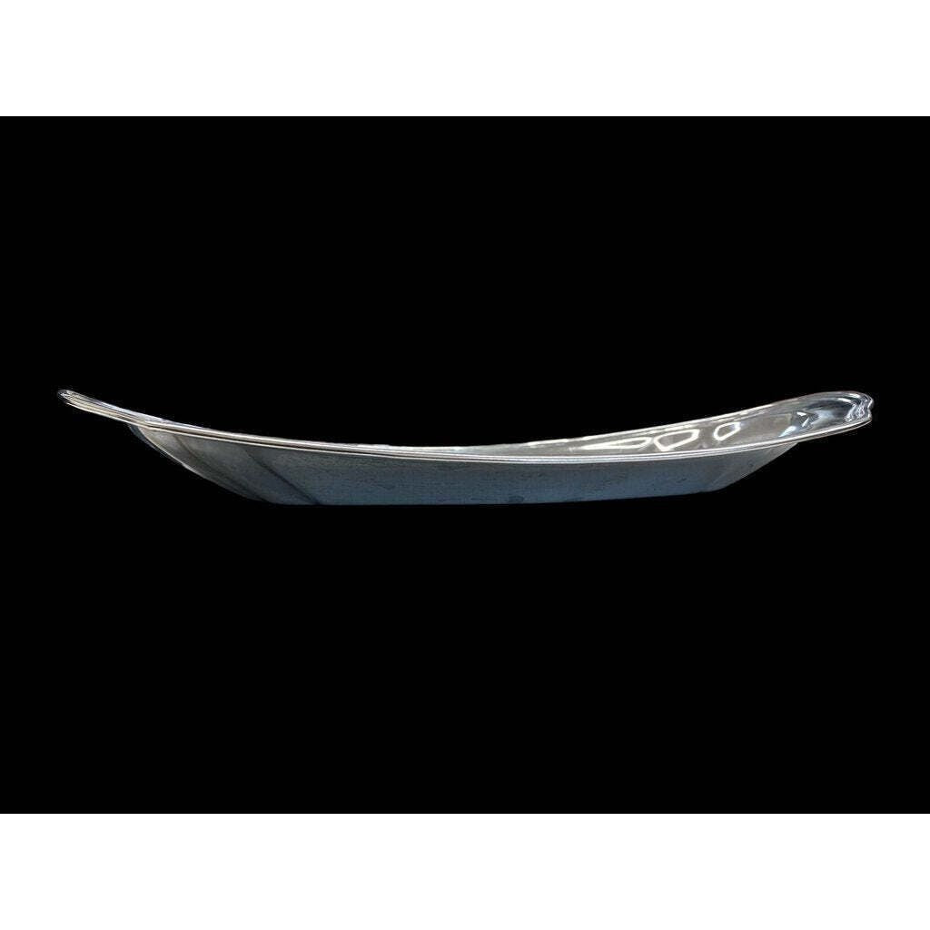 This Large Etched Silver Serving Tray Platter, sized 13" x 6.5" x 1.5", exhibits a classic etched design. Made of sturdy metal, it adds elegance to your table setting.