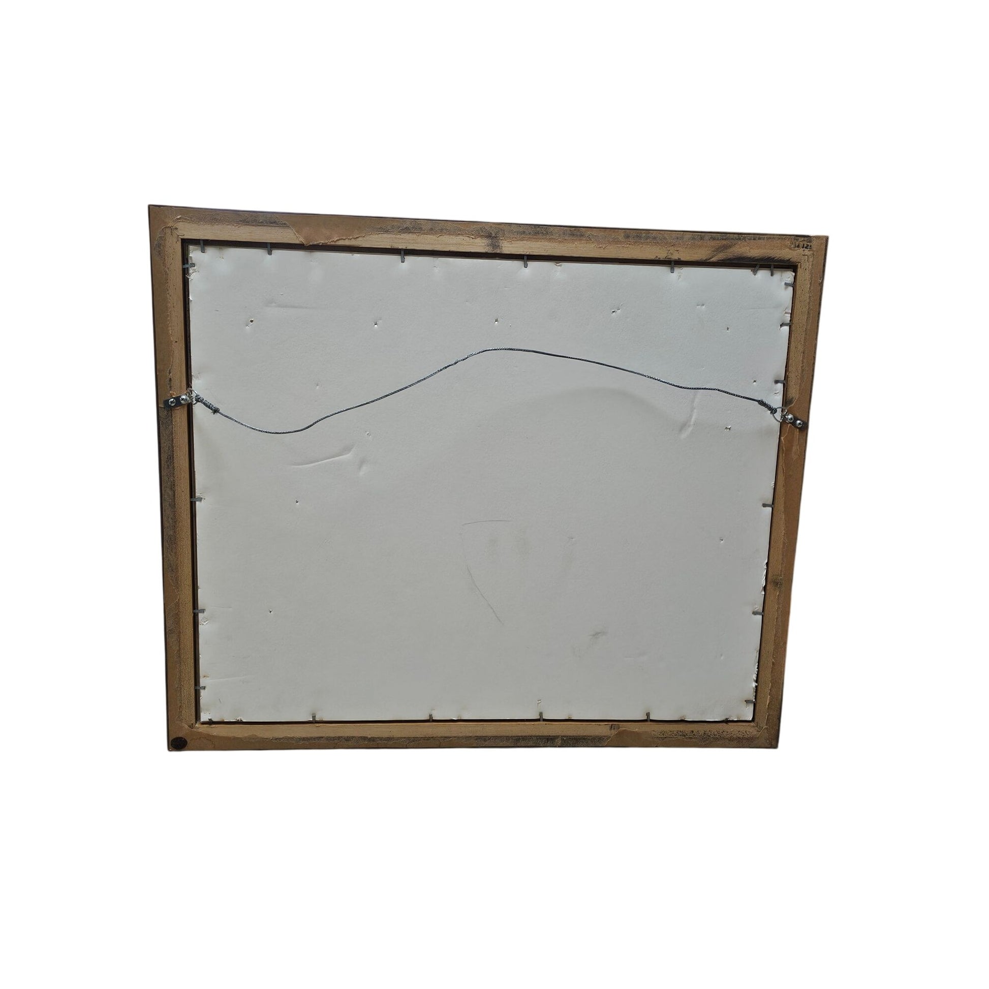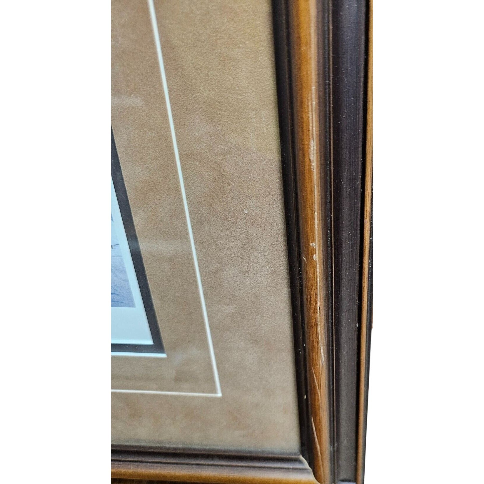 Frame back shows standard wire hanging setup. Some minor scuffs on one side of the matting and a scratch on one side of the frame.