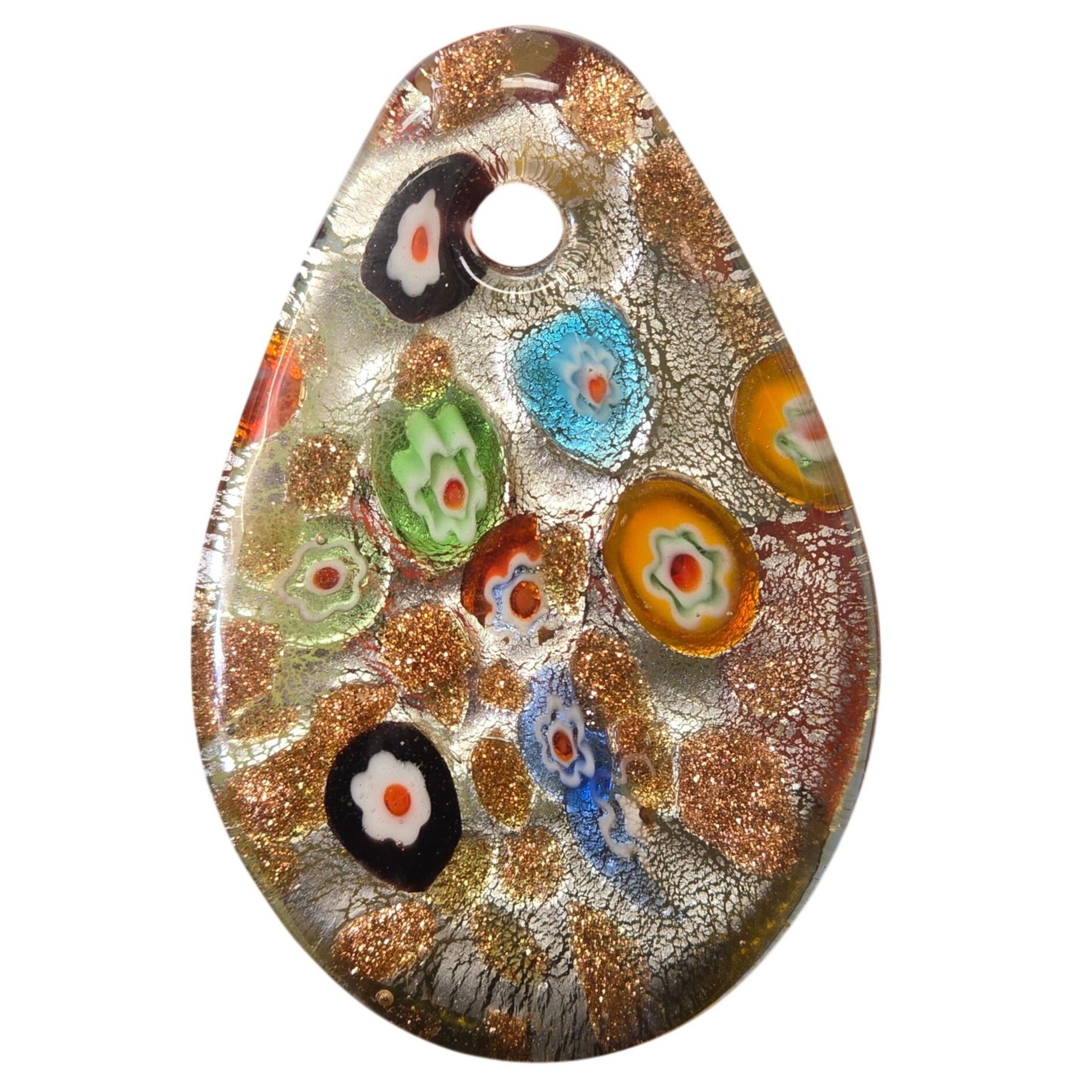 A vibrant handmade millefiori art glass pendant with a striking double‑sided design. The front features a domed layer of clear glass over colorful millefiori cane slices, giving the flowers depth and magnification. The reverse side is flat with shimmering gold and subtle impressions from the canes — a natural detail from the glass‑fusing process.