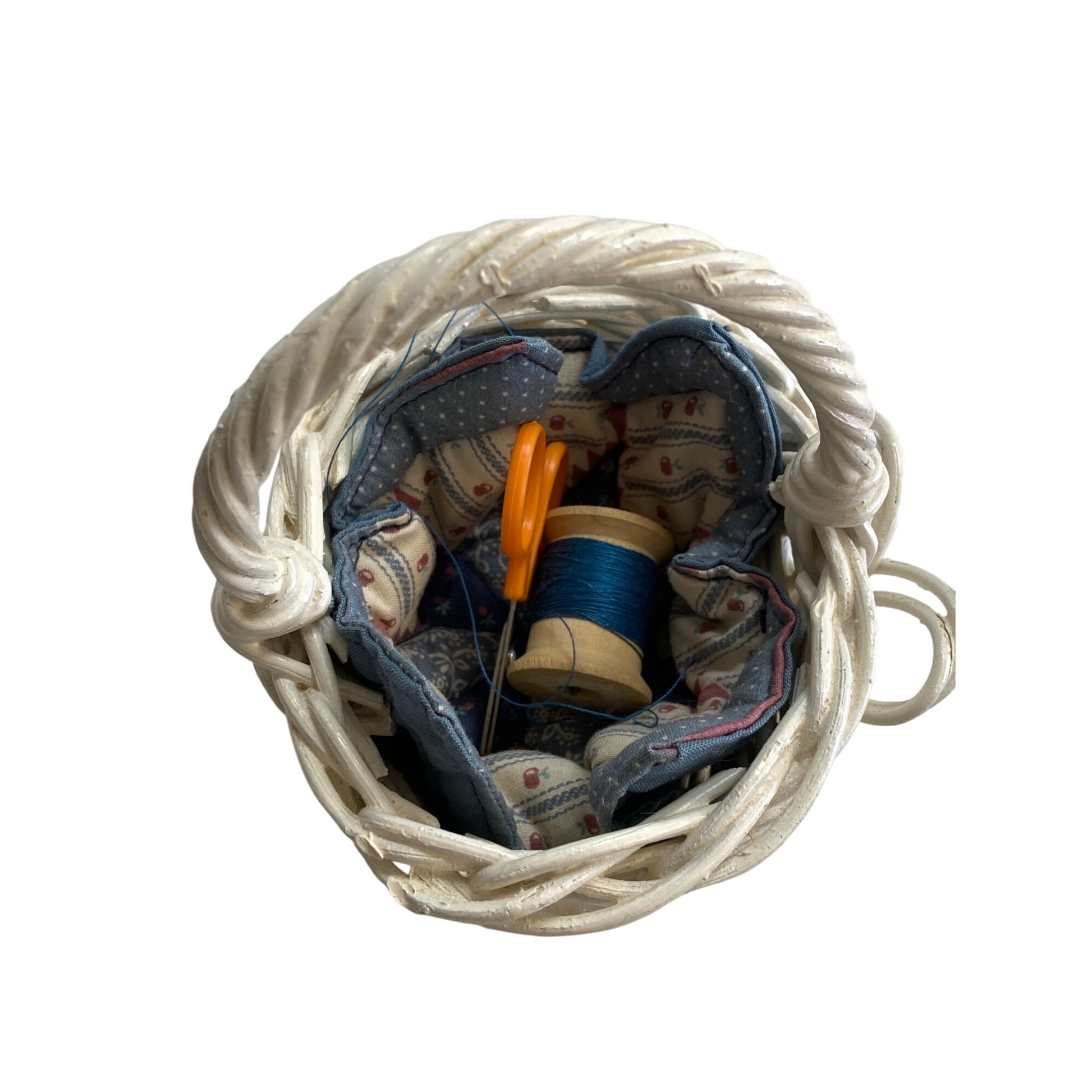 Discover the charm of this white wicker sewing basket, complete with essential accessories. Its compact design makes it an ideal choice for organizing your sewing essentials. Enhance your crafting experience with a touch of rustic elegance, making your creative process more enjoyable and efficient.