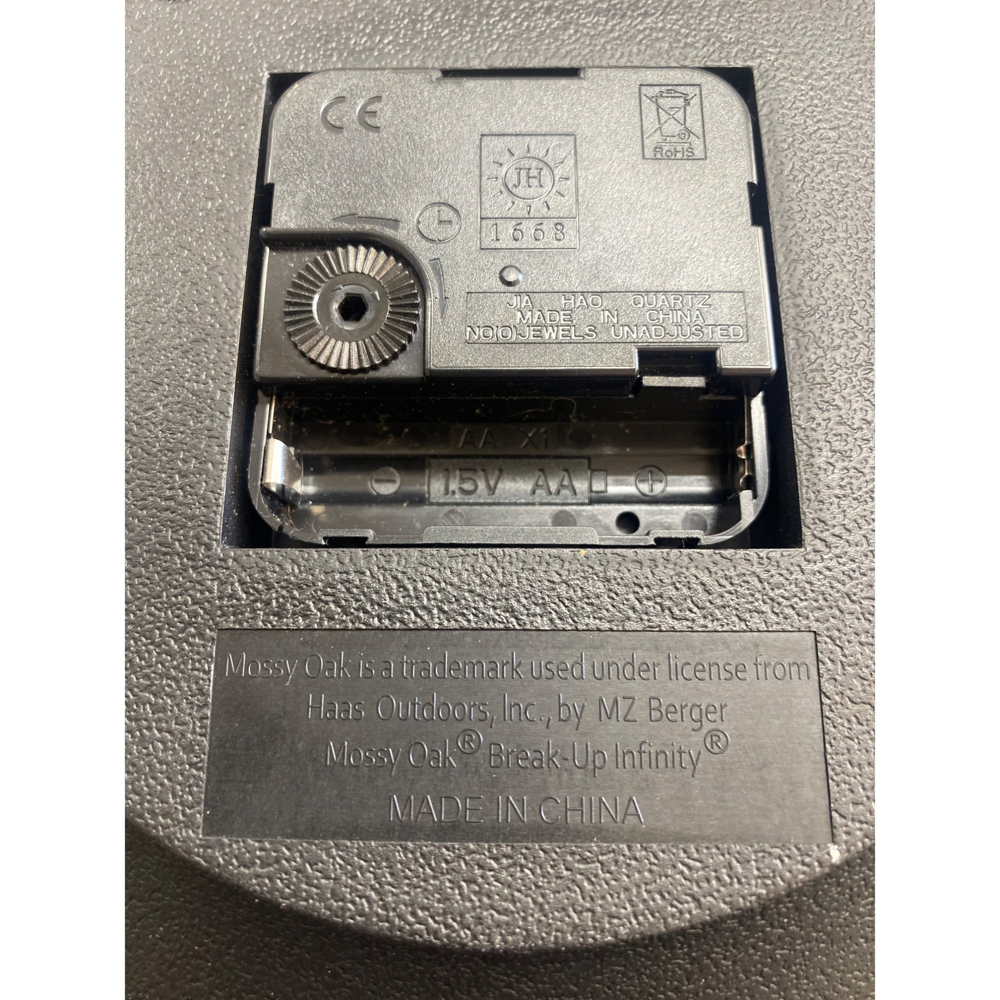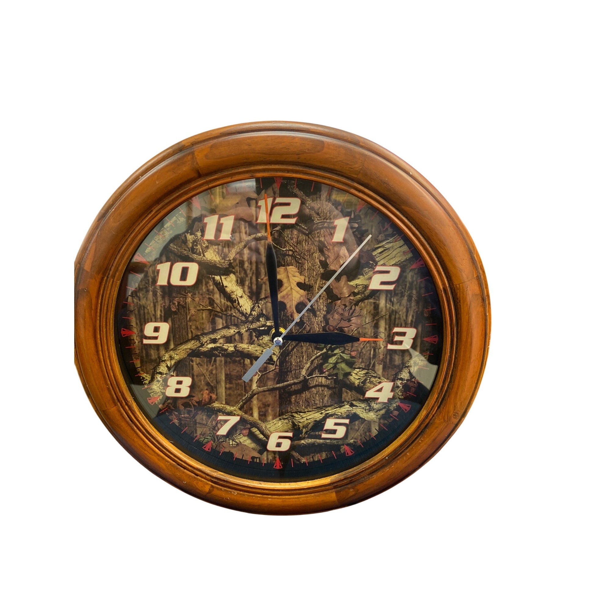A round wall clock with a distinctive Mossy Oak camouflage pattern adds a unique touch to decor. The red numbers contrast beautifully against the natural design. Made with durable wood, this clock is a functional and stylish addition to any room.