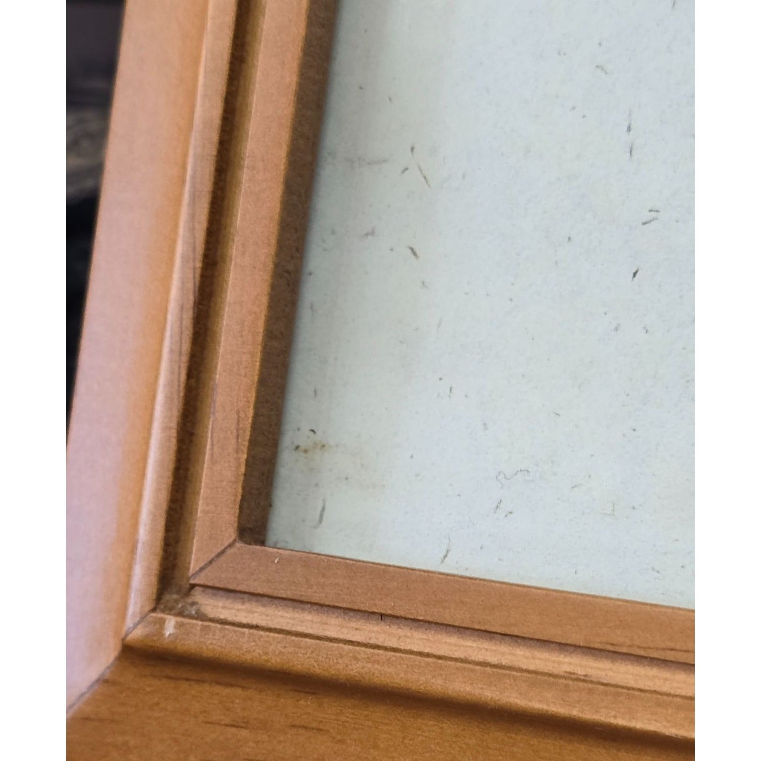 Small scratches and a minor dent on the wooden frame's lower edge.